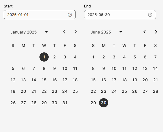 For example, if I wanted to run the report from Jan 1st to Jun 30th, I could click the arrows to scroll through the different months and click on the dates in question