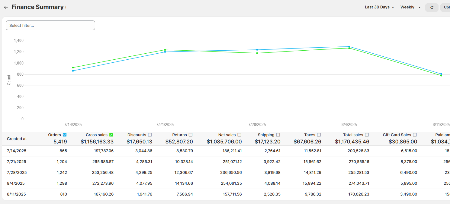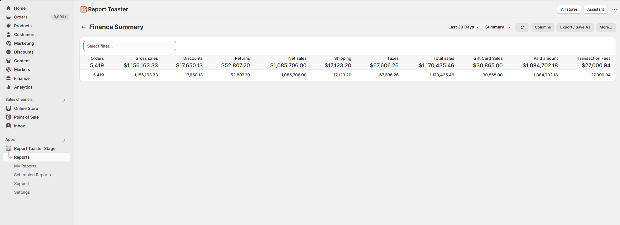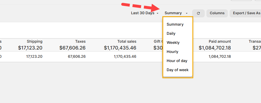 As you can see here, this displays the totals for the 'Last 30 Days', where I had 5,419 Orders, with a Total Sales of $1,170,435.46