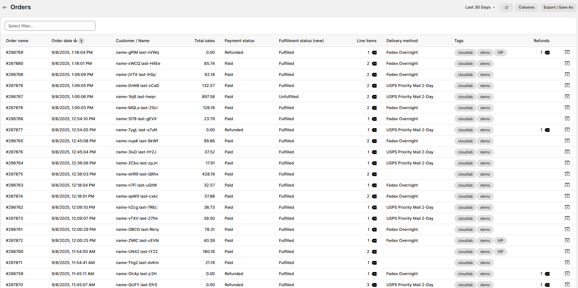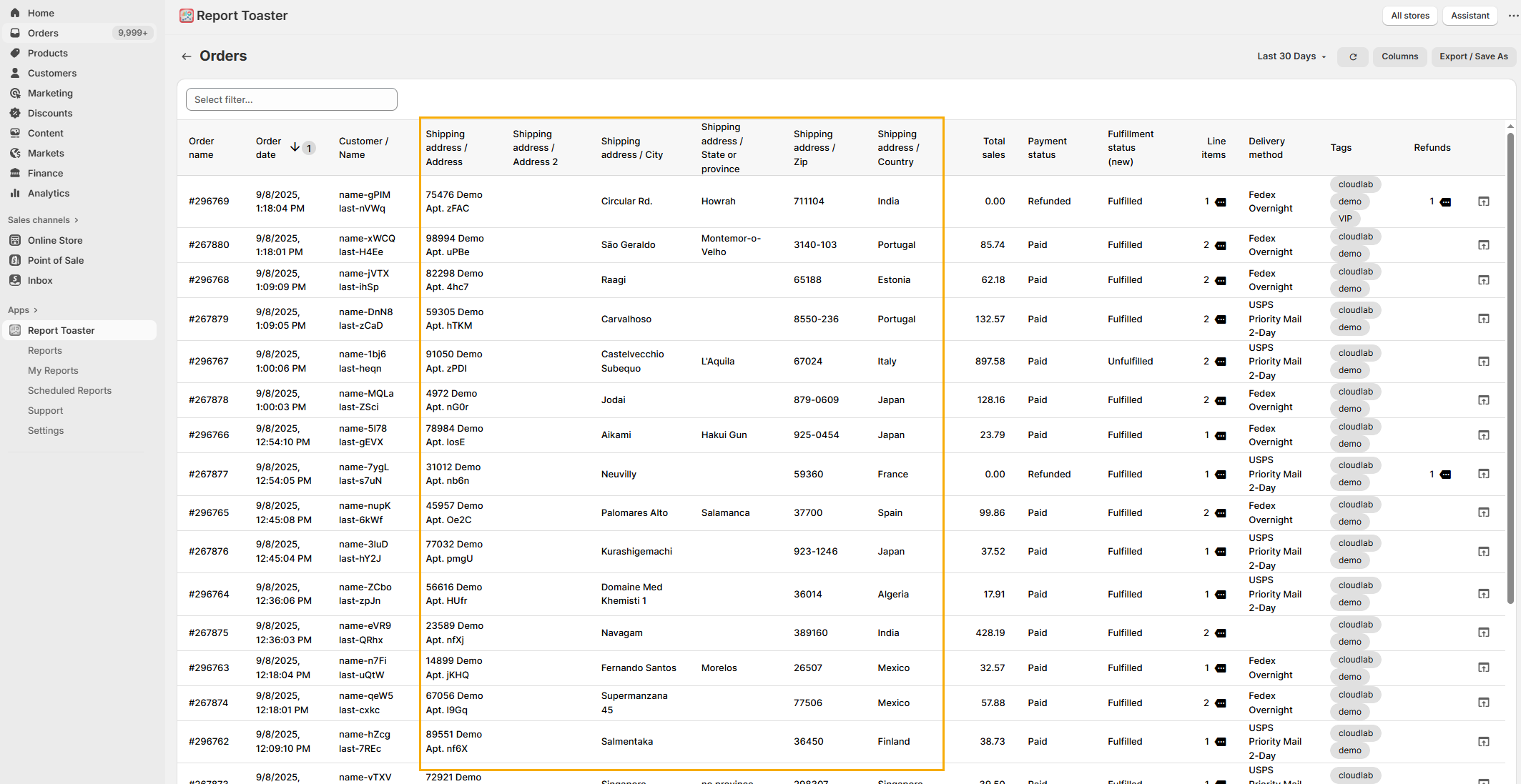 For example, let's say I was looking at the default Orders report and had decided to add columns for a bunch of shipping address information: