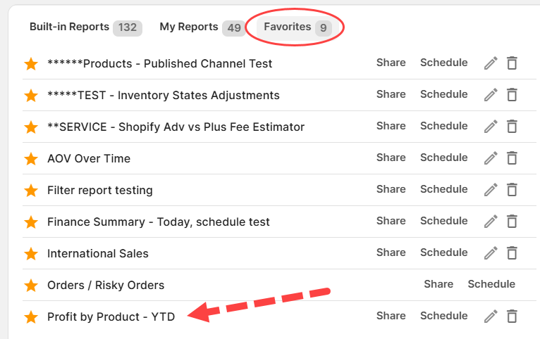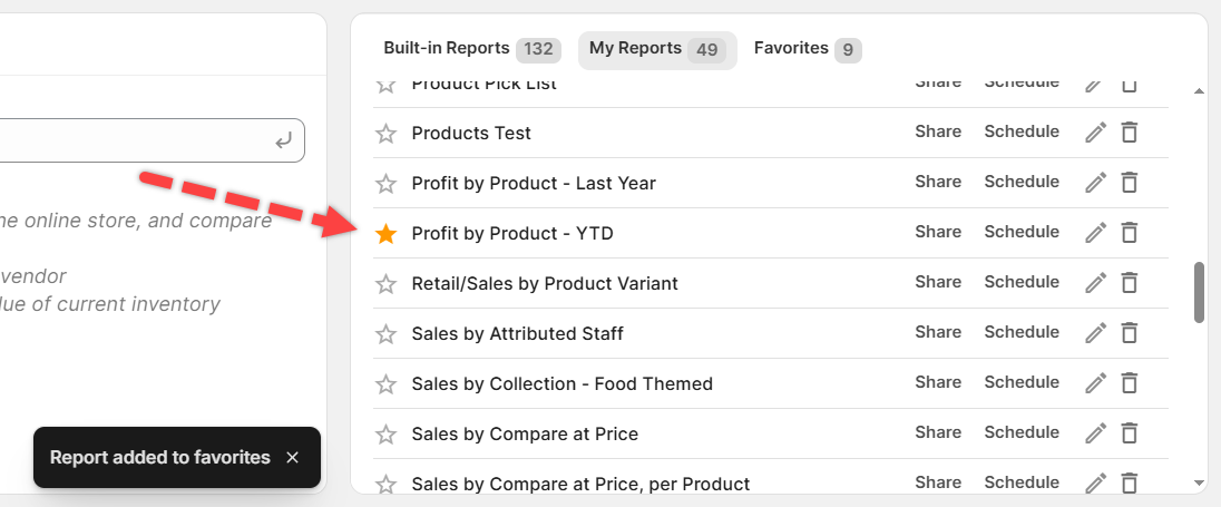 This works with both default Built-in Reports and My Reports, and is usually a good idea if you want to flag a report you frequently use so you don't have to keep searching for it.