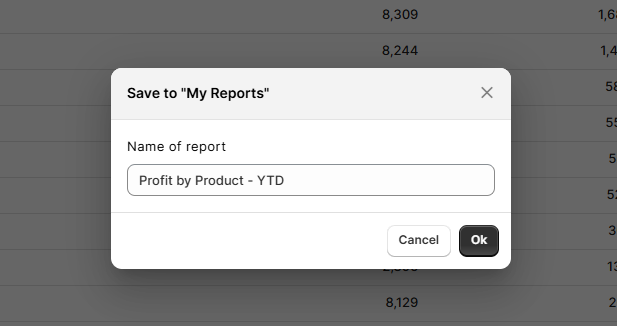 This causes a box to appear where we can give the report a name. In this case, I'm going to call this report Profit by Product - YTD (for Year to Date):