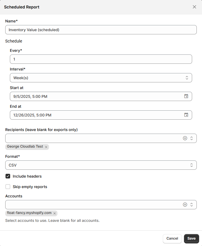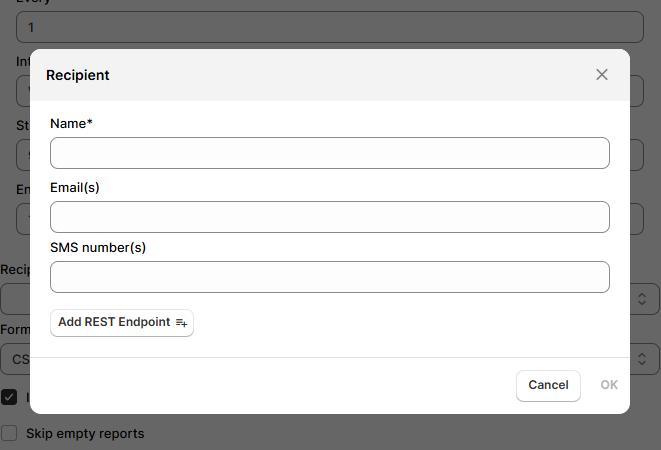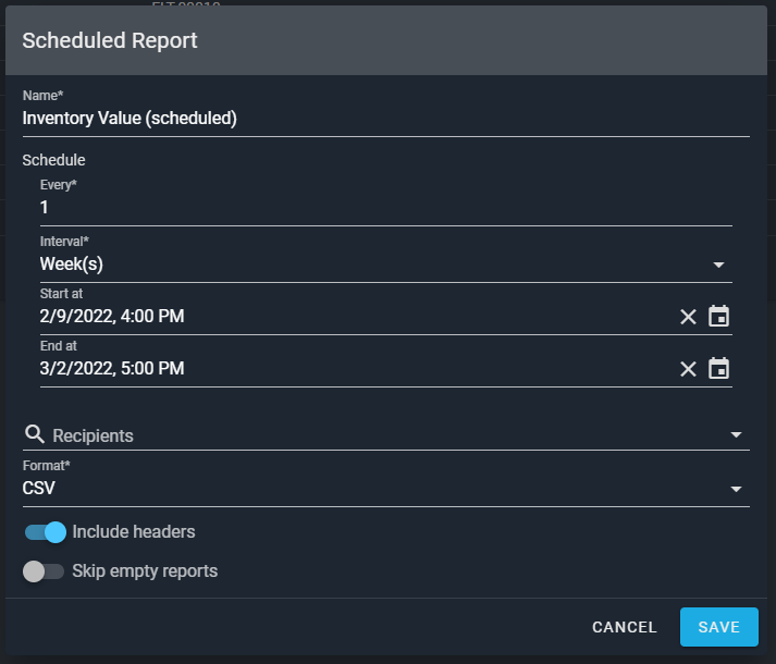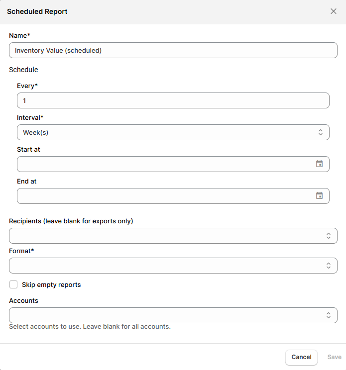 - Skip Empty Reports: If a report is blank (has no data), should it skip sending anything? (e.g. Suppose I was running a weekly report for sales of a specific item, and no items sold that week, should the system send my recipient an empty file or not?).