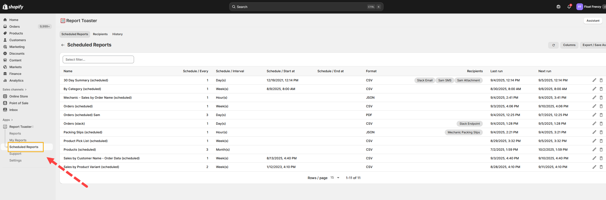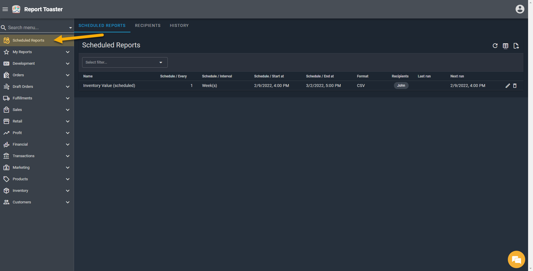 If I want to check on the status of a Scheduled Report or make any adjustments, I can go to the Scheduled Report section via the menu like so:
