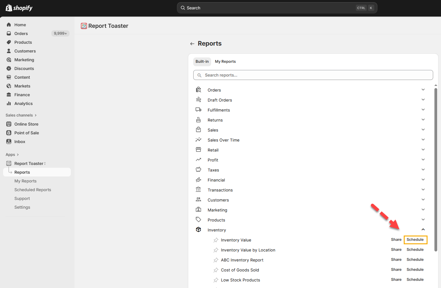 Here we'll use the built-in Inventory Value report and start off by clicking the Schedule button like so: