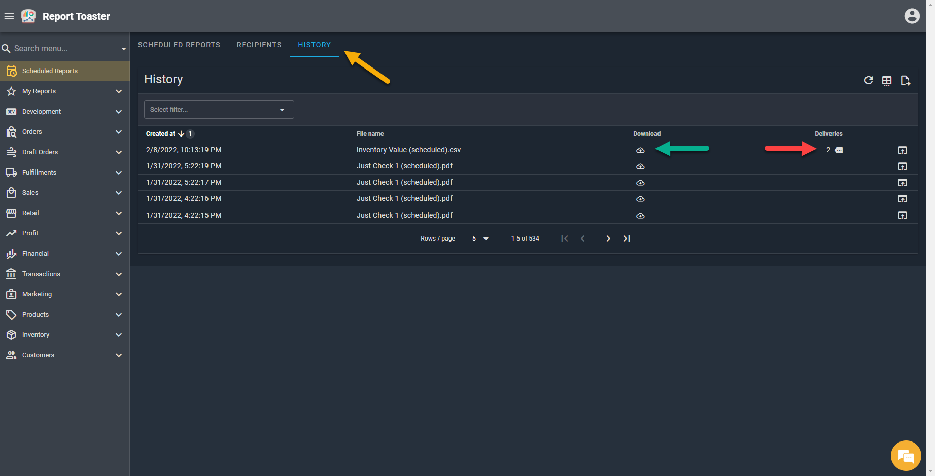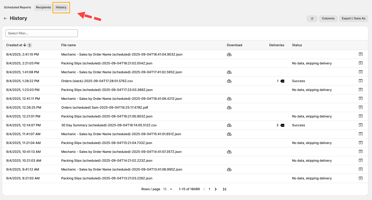 Finally, on the History tab, we can see the history of all our Scheduled Report activity: