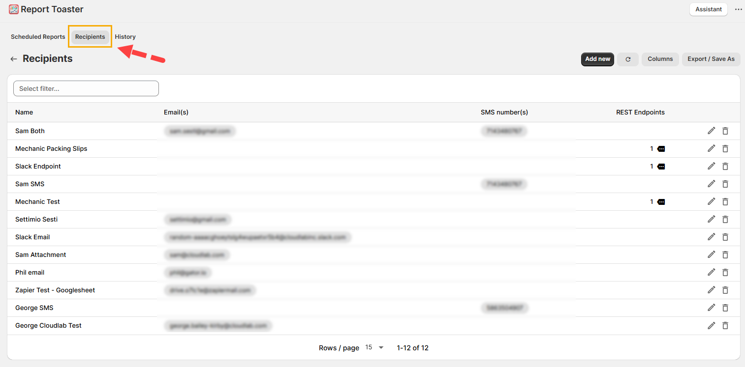 However, you can also add a new recipient from this screen by Add new (top right). This is a good way to add a recipient in even if you have yet to Schedule a report for them.