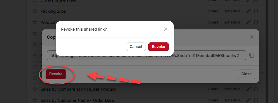 By clicking Revoke, any prior recipients of this Shared Link will no longer be able to access this report.