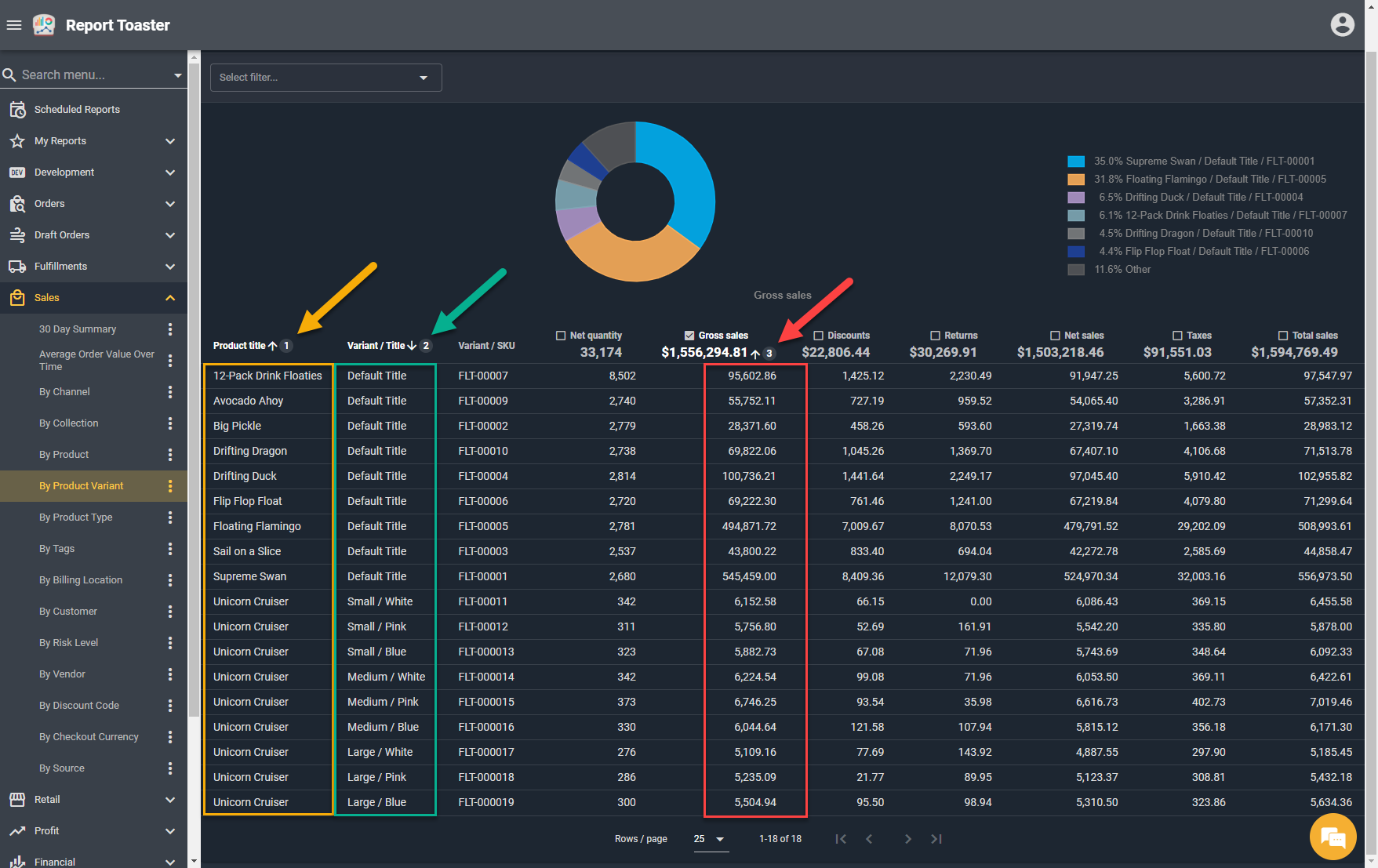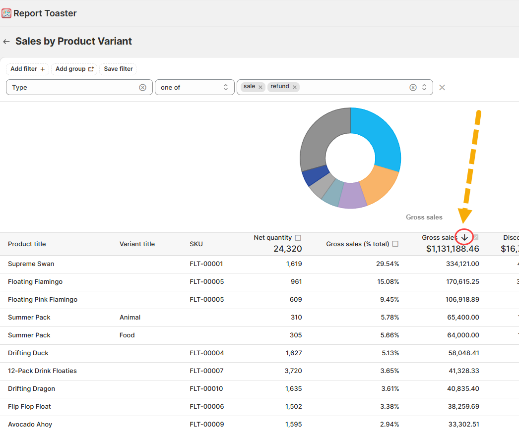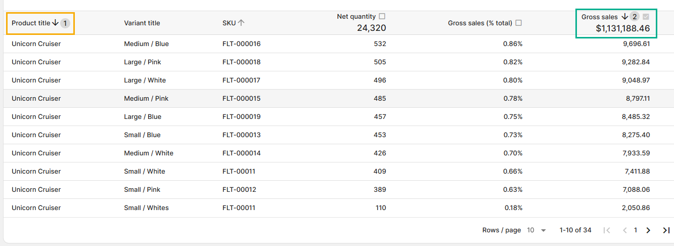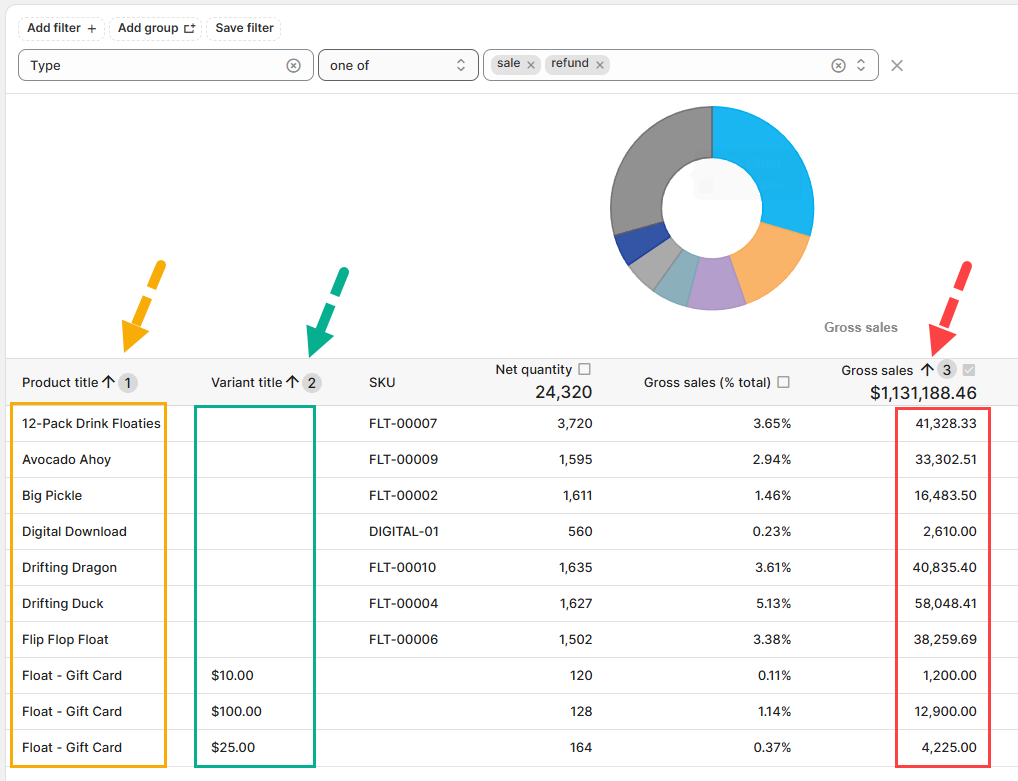 First, let's start with that basic 'Sales by Product Variant' report and have it sorted by Product Title, then by Gross Sales: