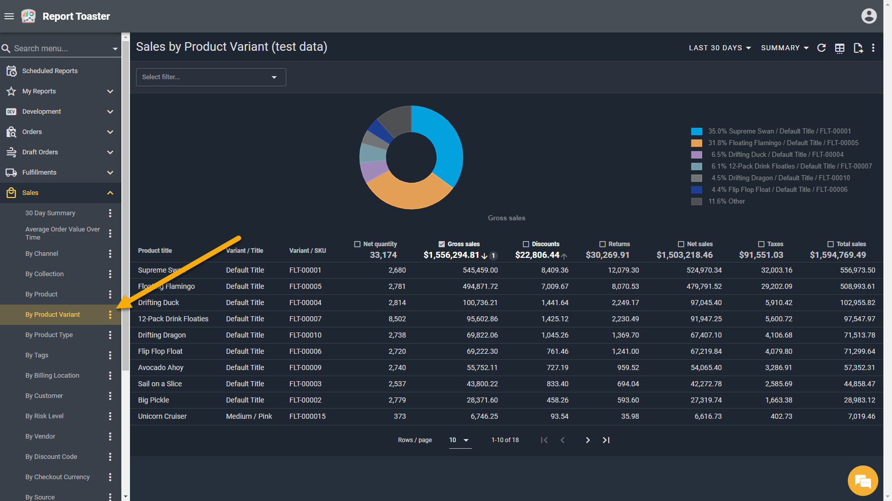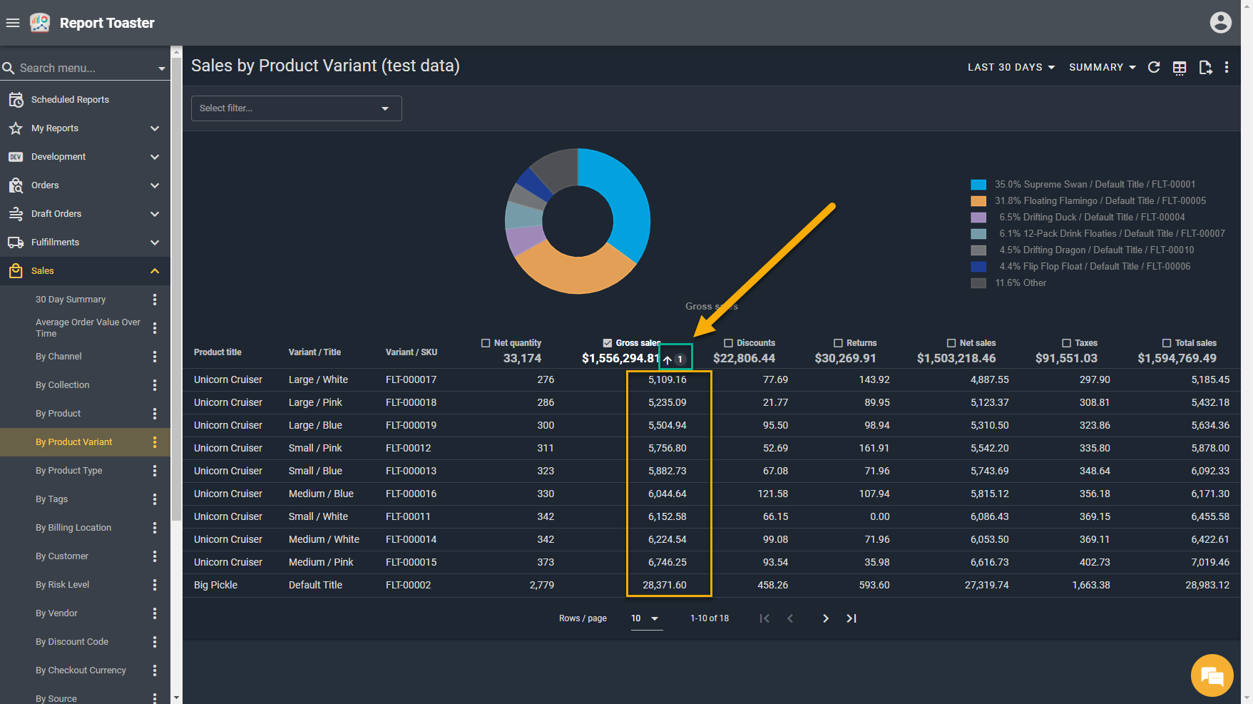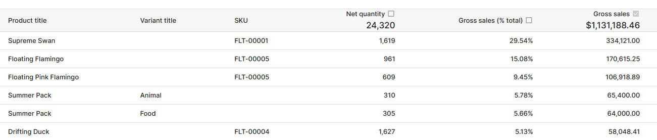 First, let's start with that basic 'Sales by Product Variant' report and have it sorted by Product Title, then by Gross Sales: