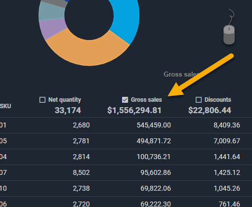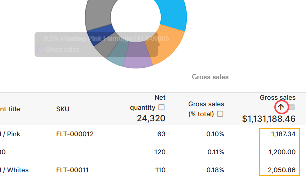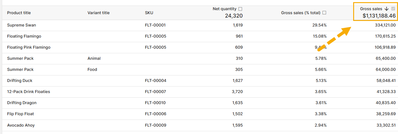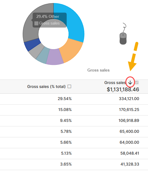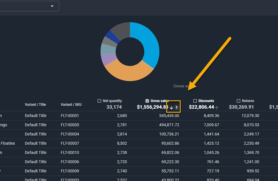 Right away, you can tell from the direction of the arrow that all of the data is sorted by 'Gross sales', descending from Highest to Lowest.