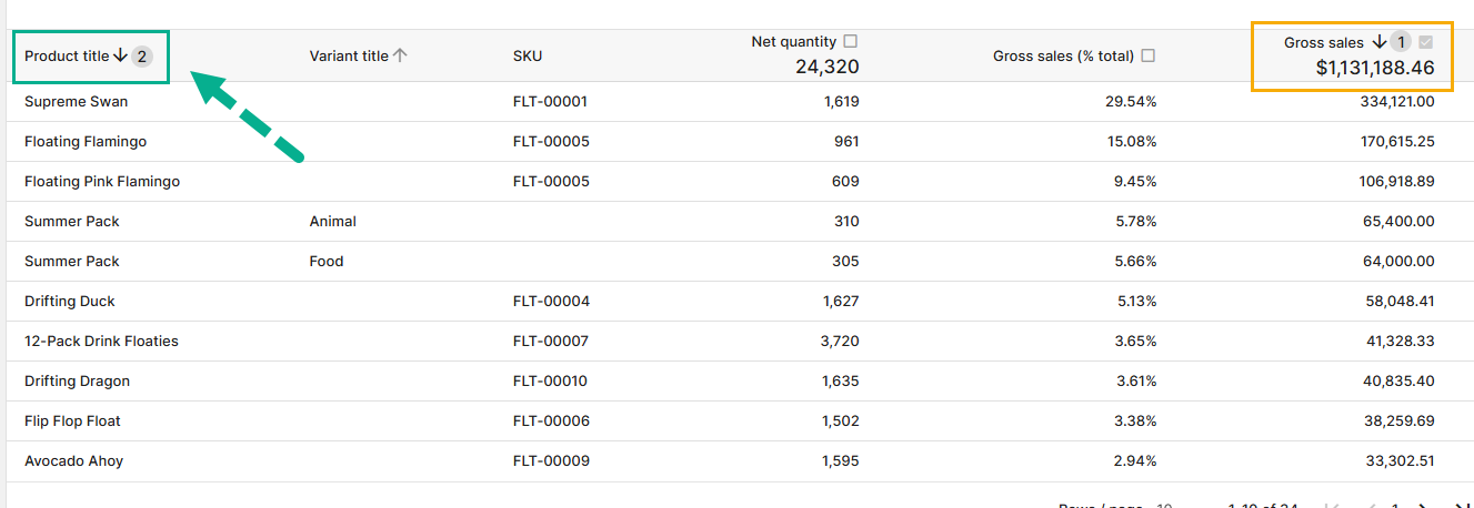 Now suppose I want to change it to sort by Gross Sales first, then product title.