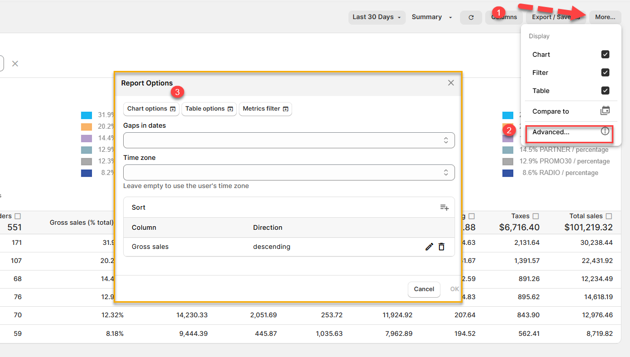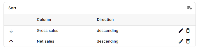 - If you have multiple sorts, you can use the arrows to change the order (i.e. in this case it is sorting by Gross Sales descending, then Net Sales descending)
