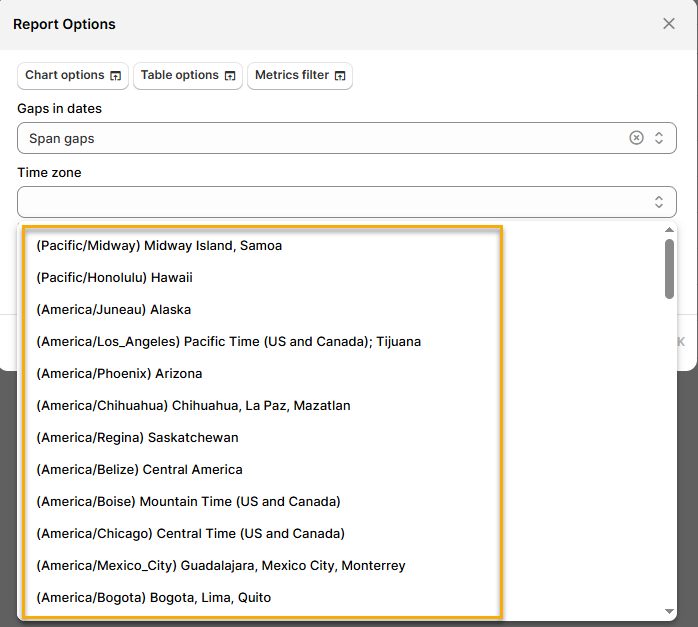 From the time zone dropdown, you can then set the appropriate time zone for this individual report: