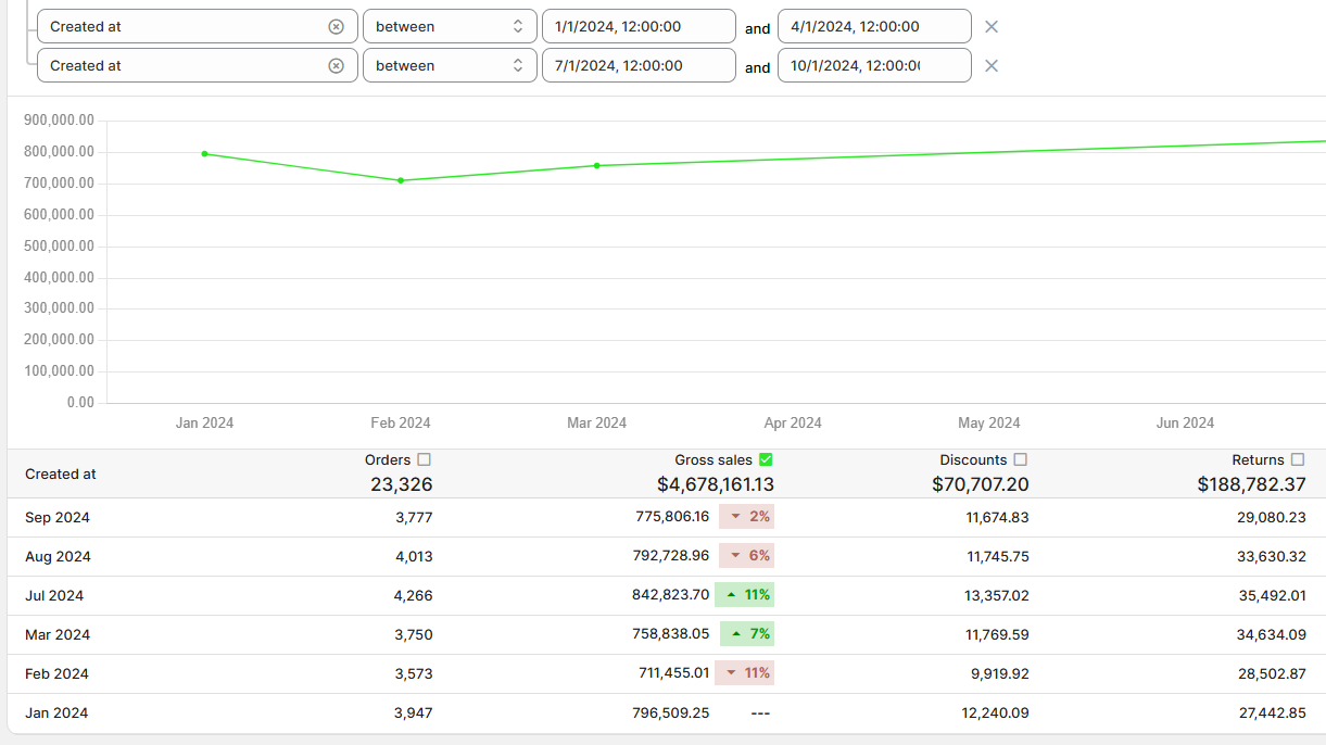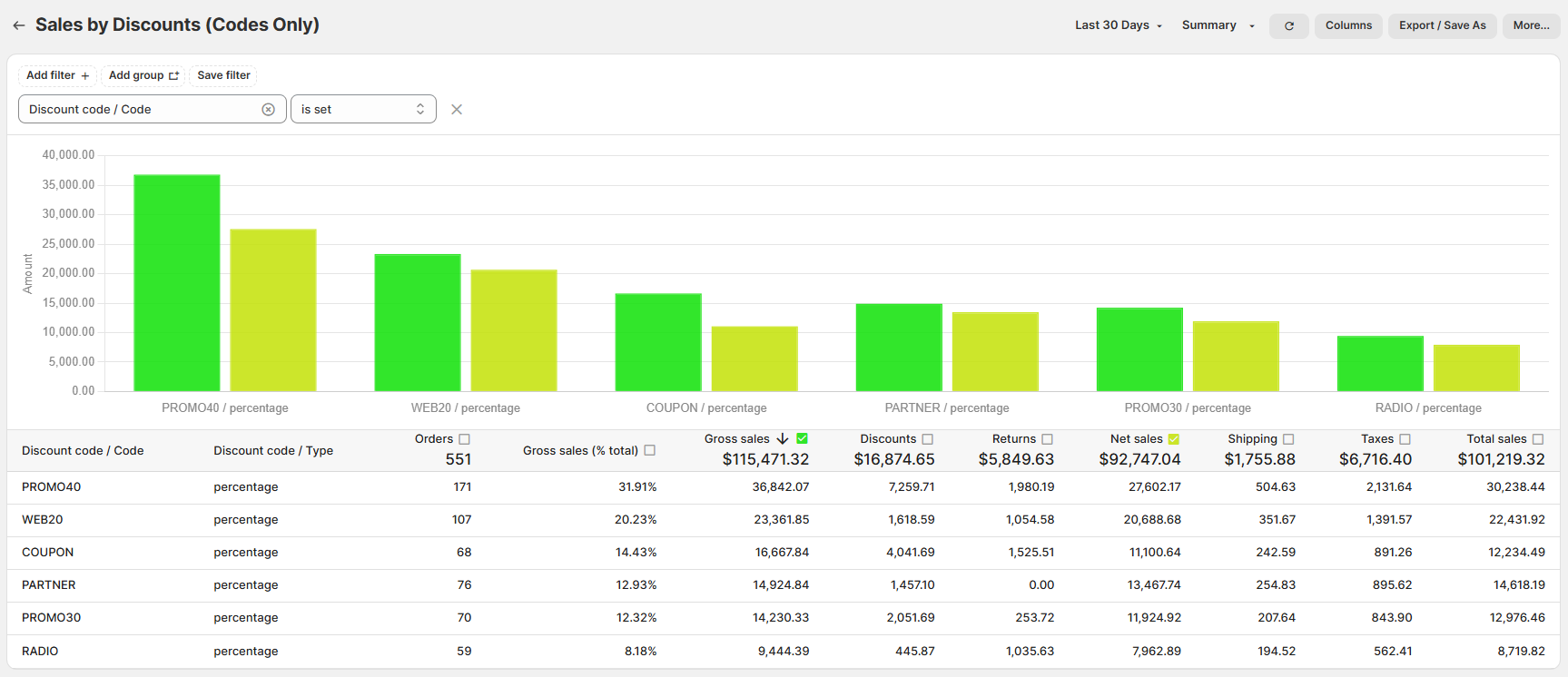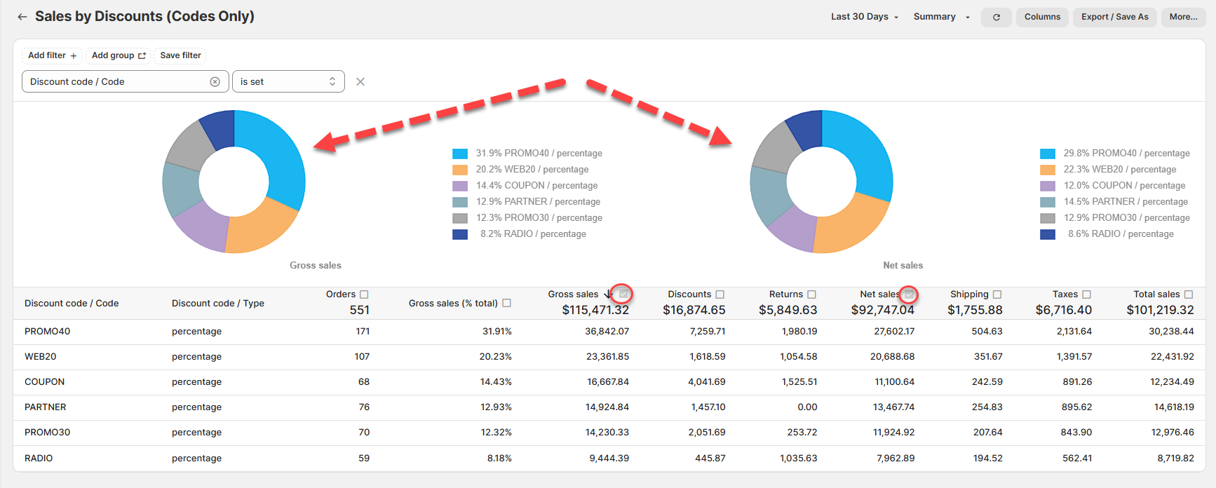 For example, if I wanted the Sales by Discount Code to display 2 different charts comparing Gross Sales and Net Sales, I could toggle on both like so: