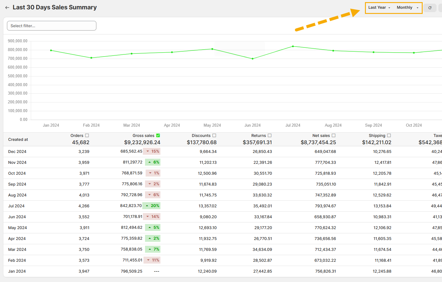 For instance, suppose I looked at this modified version of a 30-day Sales Summary report, and expanded to cover Sales over the last year in a monthly breakdown: