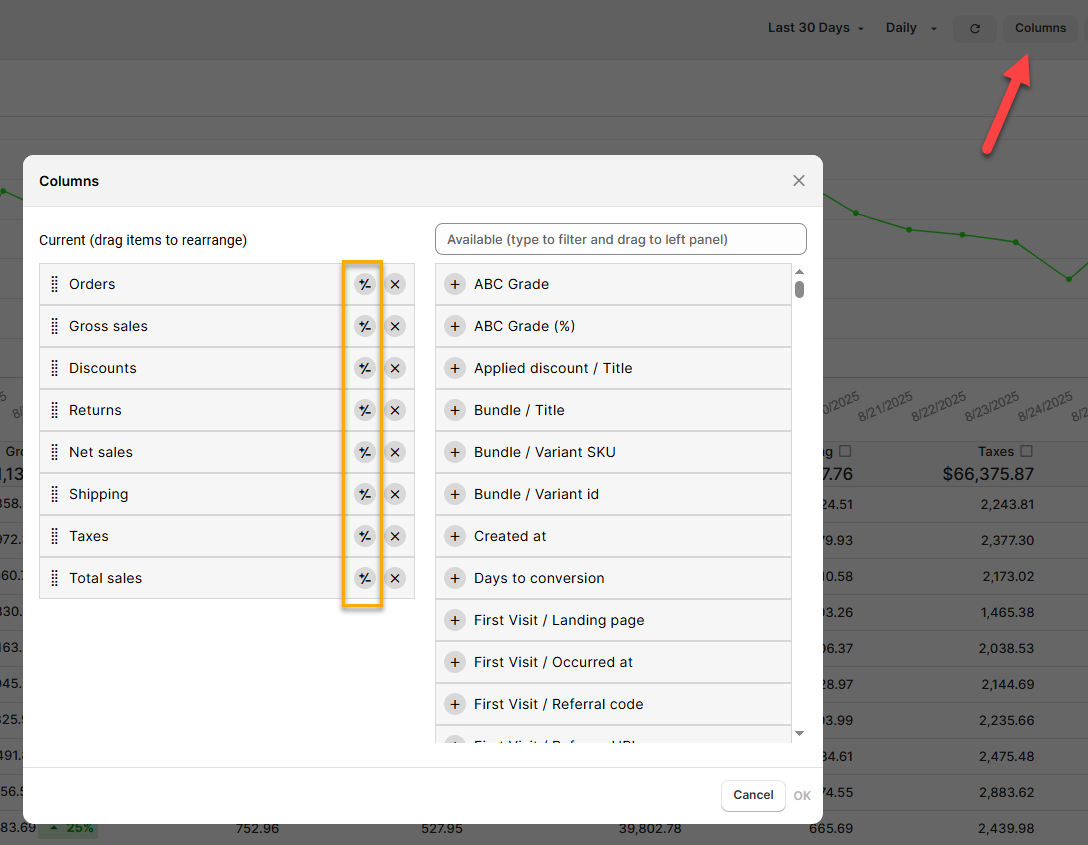 Click the Columns button (top right) to adjust the columns that appear on the report: