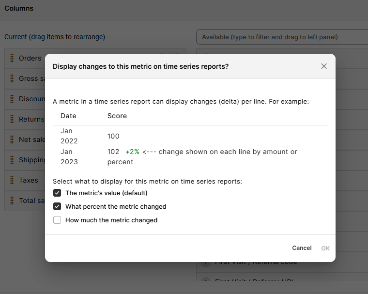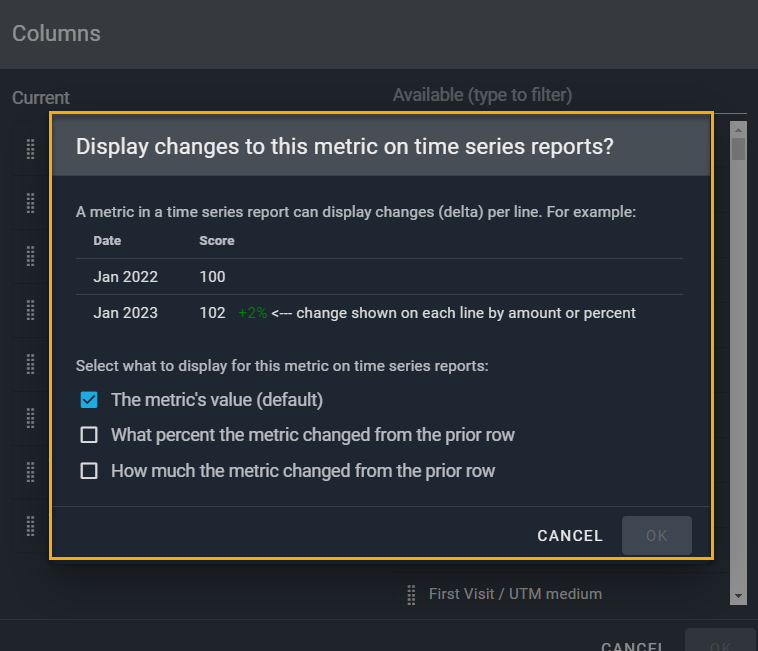 A Metric on a Time Series (think a chart report with a breakdown like Daily, Weekly, Monthly etc) can also then have a comparison added in the table like so: