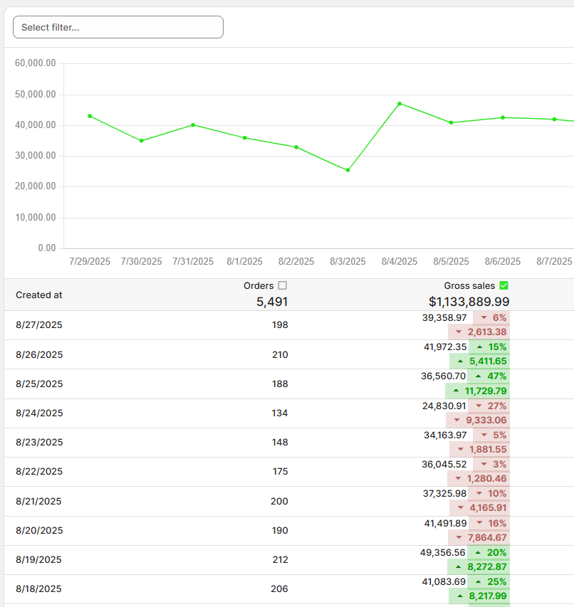 So for example, if we're looking to compare our Gross Sales each day and how they have increased/decreased, lets click the +/- button next to that.