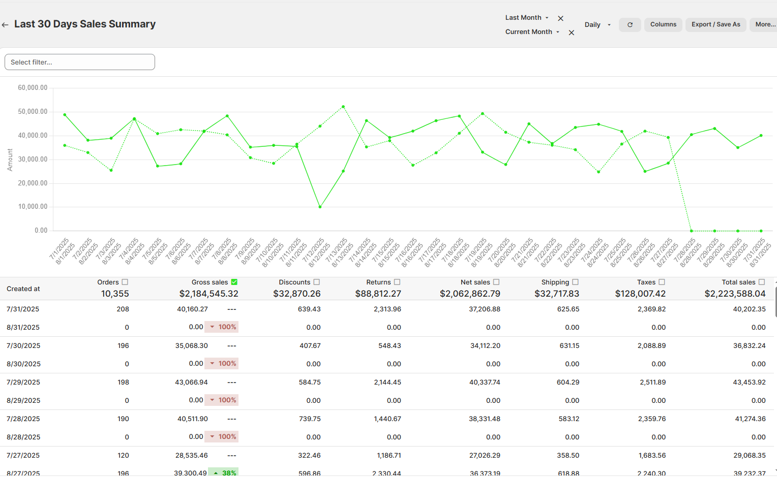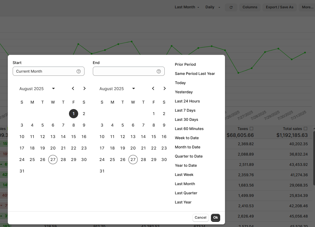 So here we'll put Last Month and choose a Daily breakdown so we can see how each day compares in terms of Sales performance.