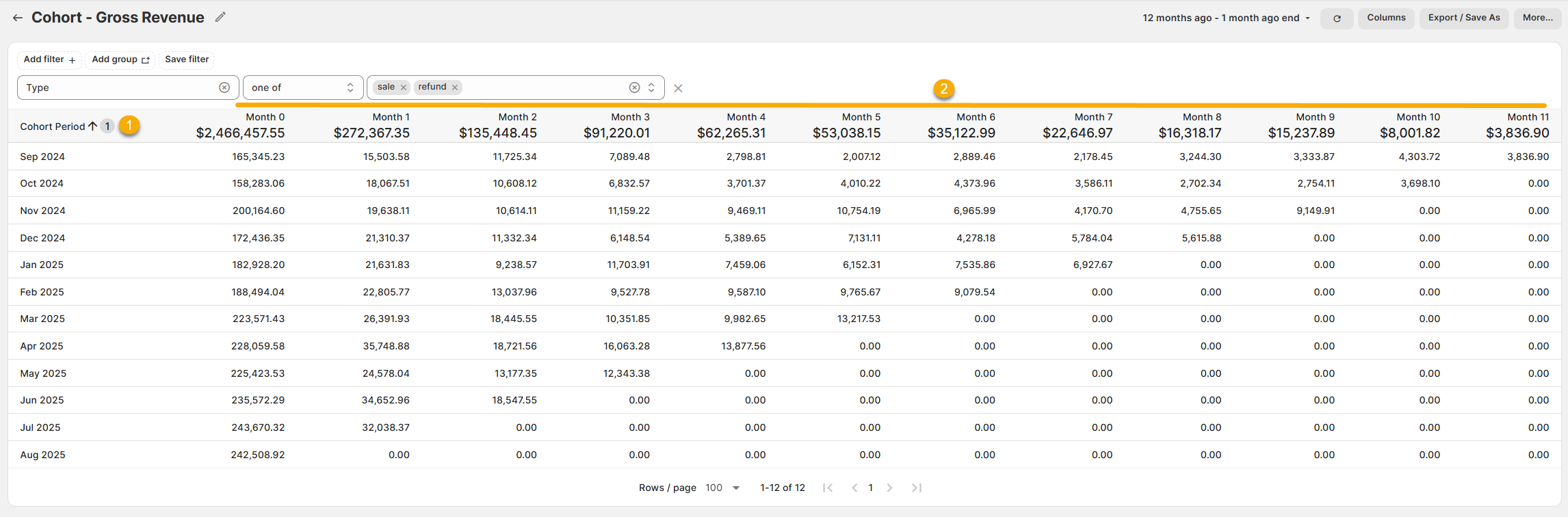 2.) Month 0, 1, 2, 3 (etc..): The sum of the selected metric for each cohort row. This displays the selected metric (Revenue, Customers, or Retention %) over the months since the acquisition of the original cohort.