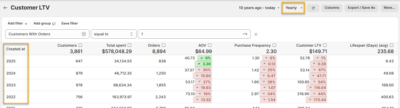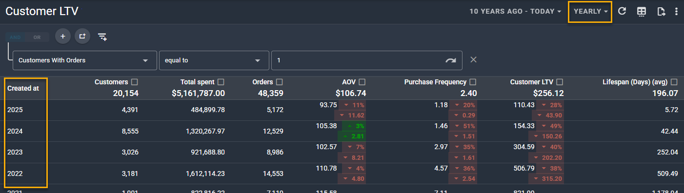 Doing this automatically enables the comparison metrics - so you can see how your LTV changes between customers created in 2024 vs 2025.