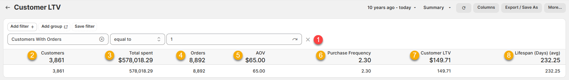 This report shows you key customer metrics - Average Over Value (AOV), Purchase Frequency, and of course, Lifetime Value (LTV).