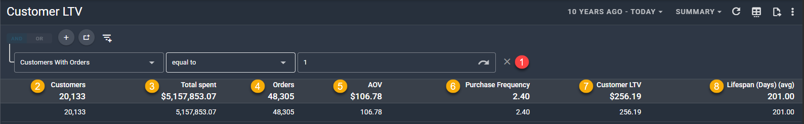 By default, the report is set to cover all customers created in the last 10 years as a total summary (but see the section below for turning it into a cohort)