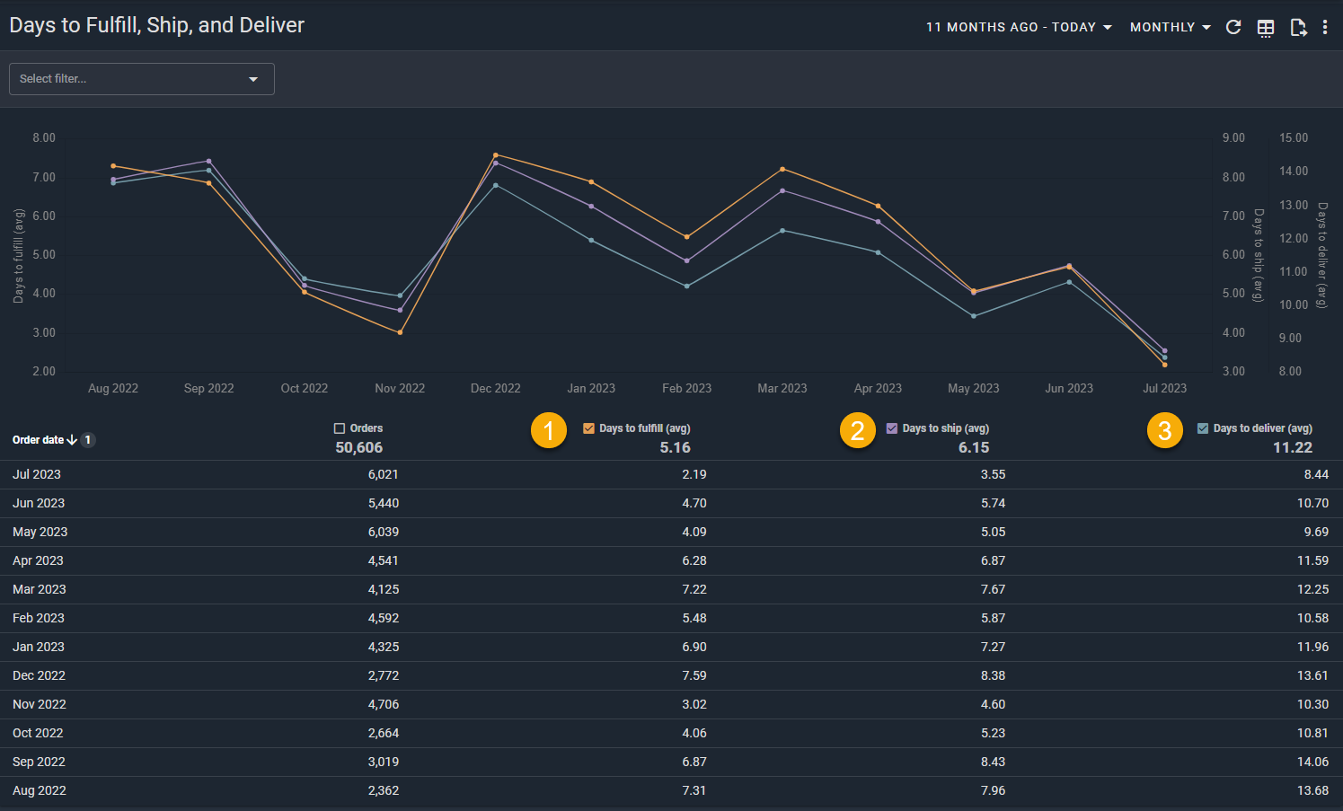 This report is used to see how long it takes you (on average) to Fulfill, Ship, and Deliver Orders each month so you can assess your fulfillment team's performance.