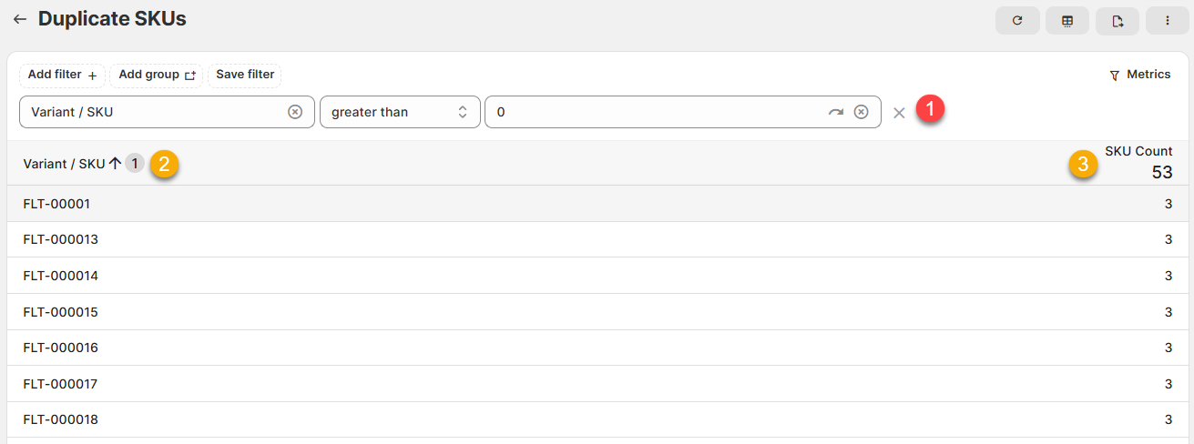 For example, looking at the above, we can see that FLT-00001 appears on more than 1 product variant