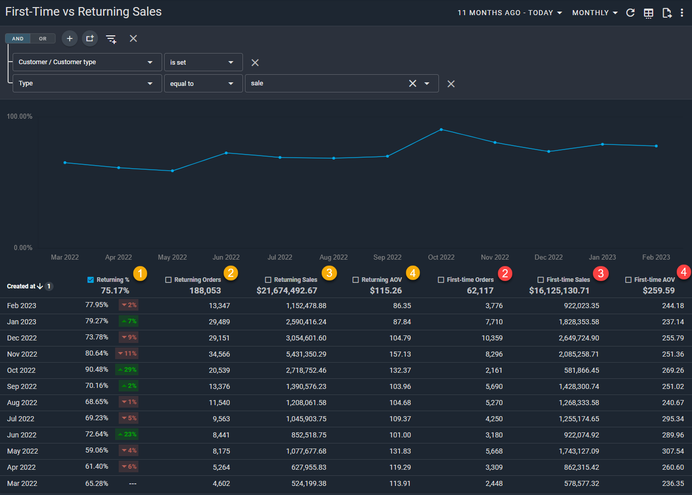 For example, if 27,441 Orders out of 33,103 total came from Returning Customers one month, the Returning % for that month would be 82.90%.