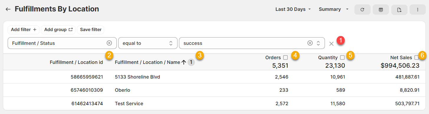 1.) Fulfillment / Status, equal to, success: This filter ensures that only successful Fulfillments are counted in the report.