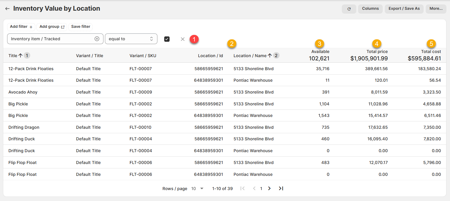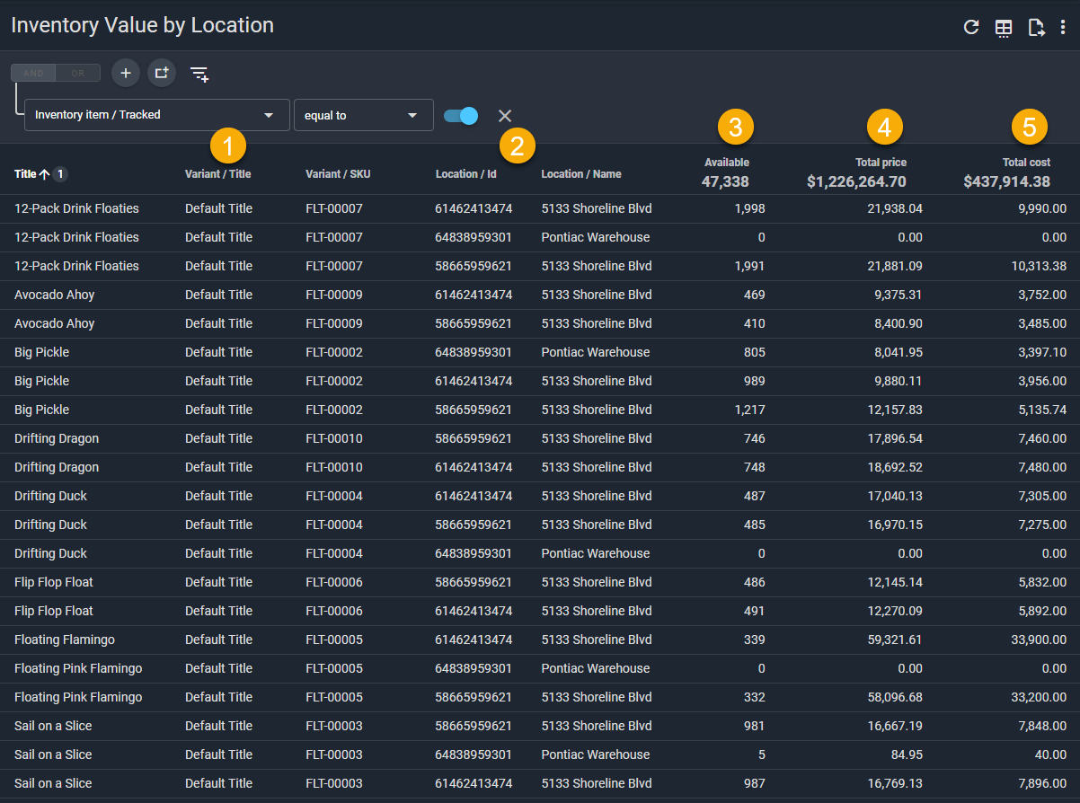1.) Inventory item/Tracked, equal to, true (FILTER): This filter ensures that only tracked inventory shows in the report. It's best to leave this alone.