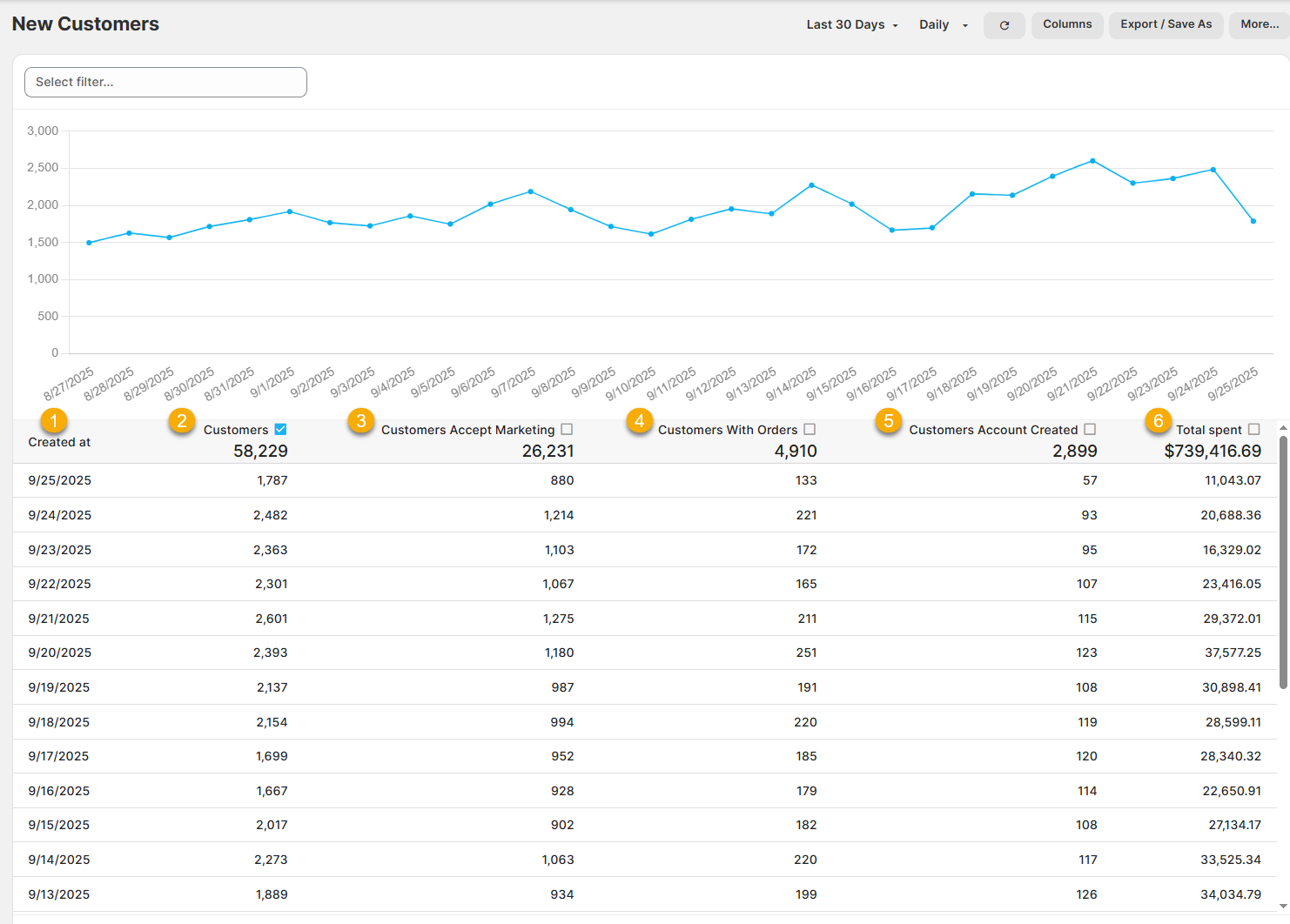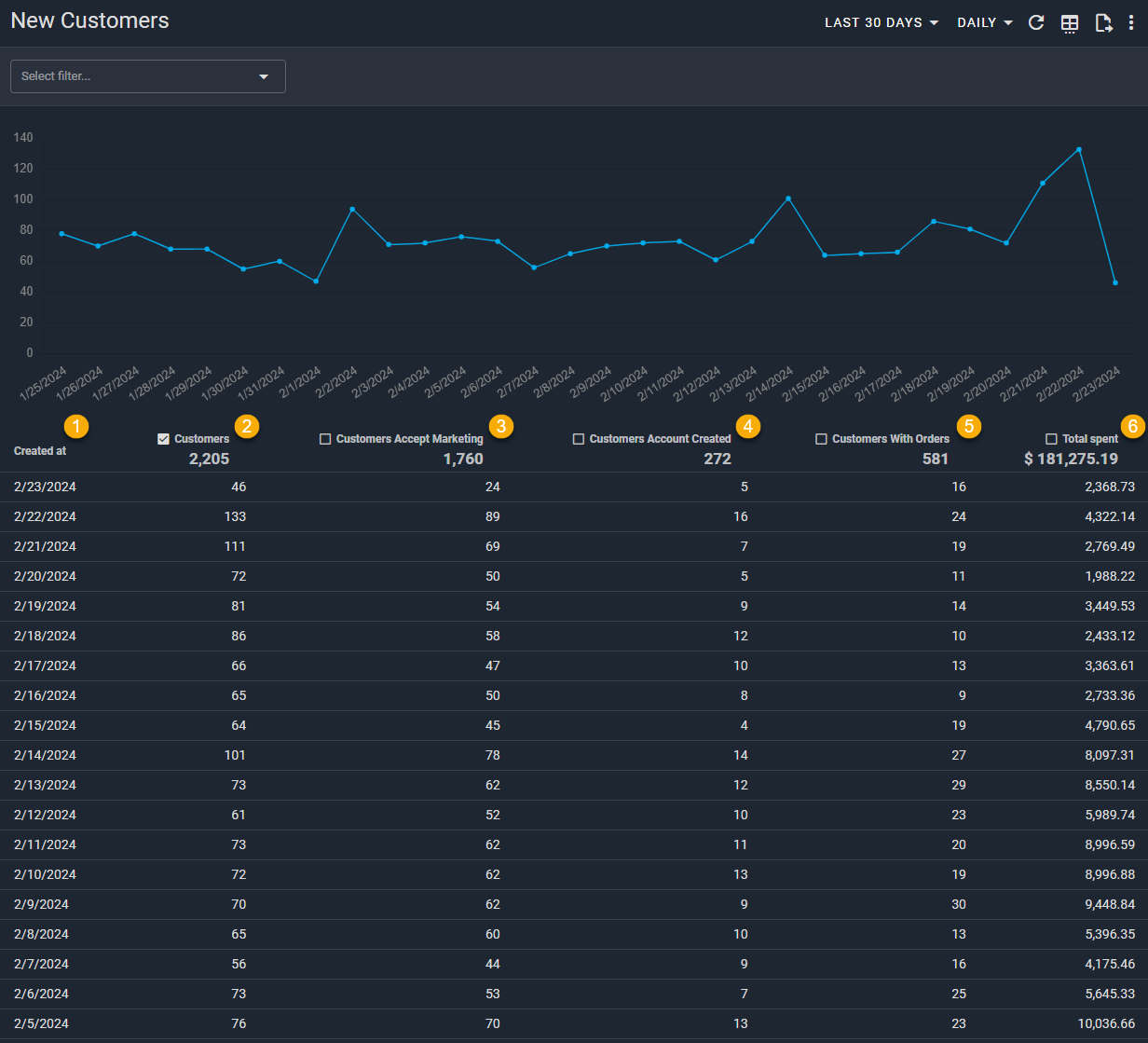 Using this report, you can see how many customers you added on any given day, how many of them have accepted marketing, created accounts, and placed orders at your store.