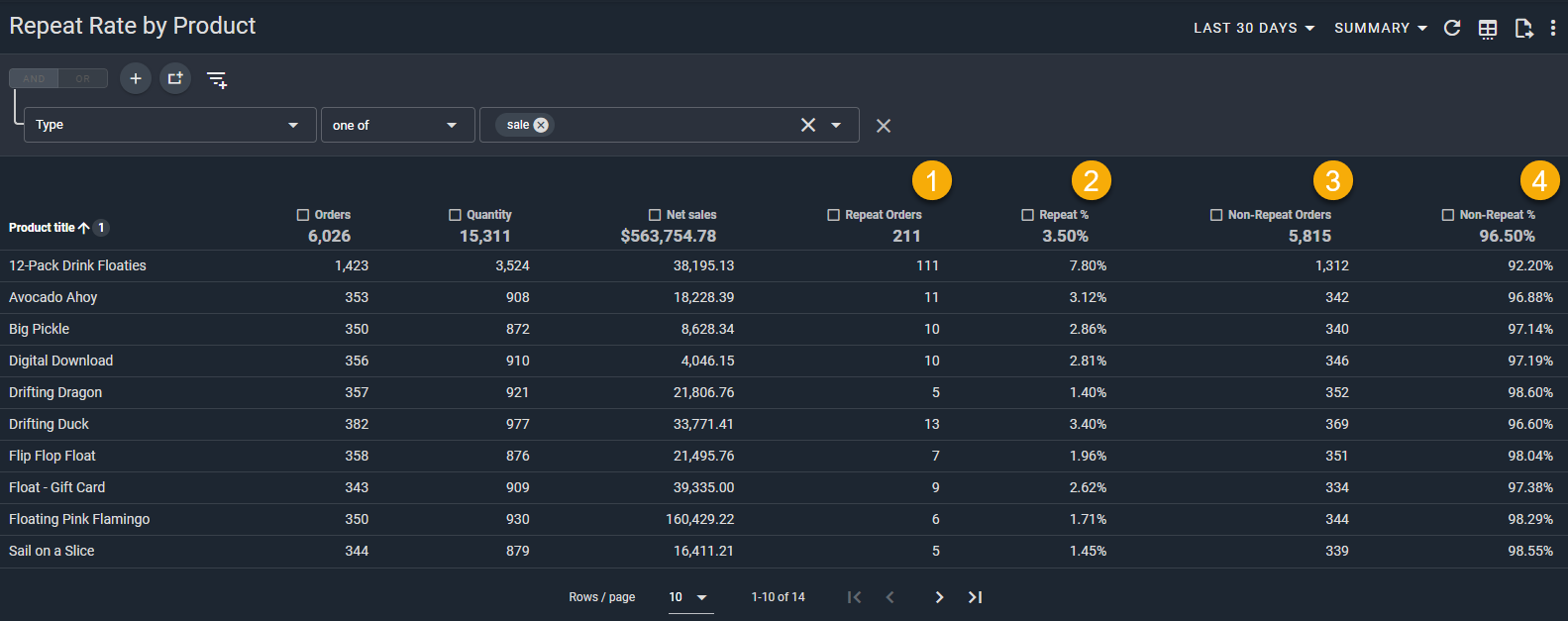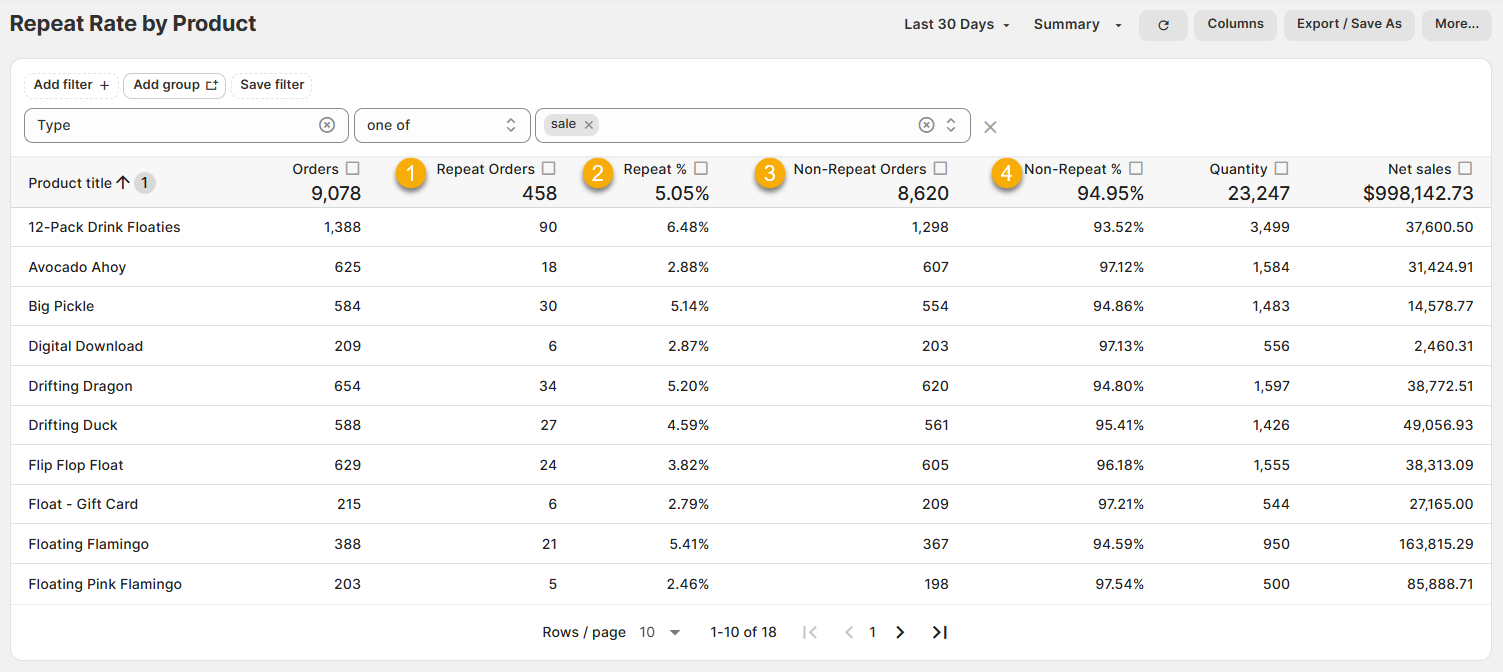 Here are a few terms to be familiar with in order to understand Repeat Rate by Product, numbered in the screenshots above: