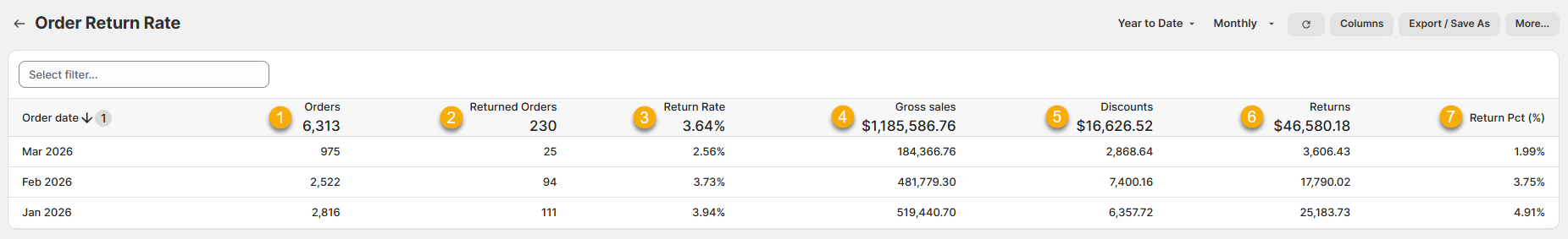 For example, if I had 94 Returned Orders out of 2,522 total, the Return Rate would be 94/2,522 x 100 = 3.73%.