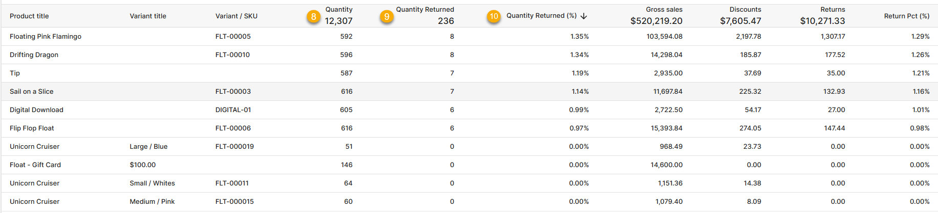 For example, if 8 units of the Floating Flamingo product had a refund, the Quantity Returned would display as 8.