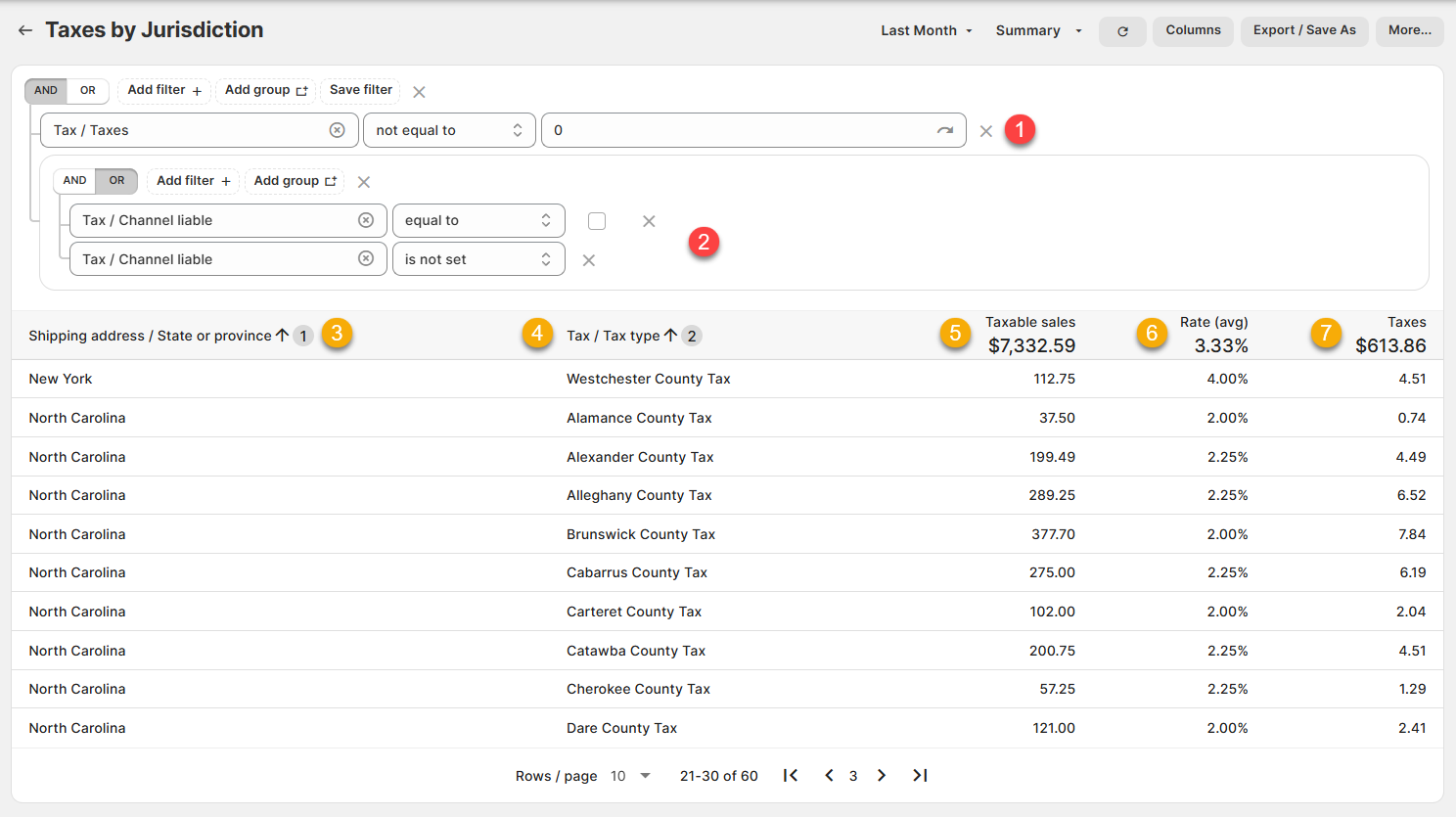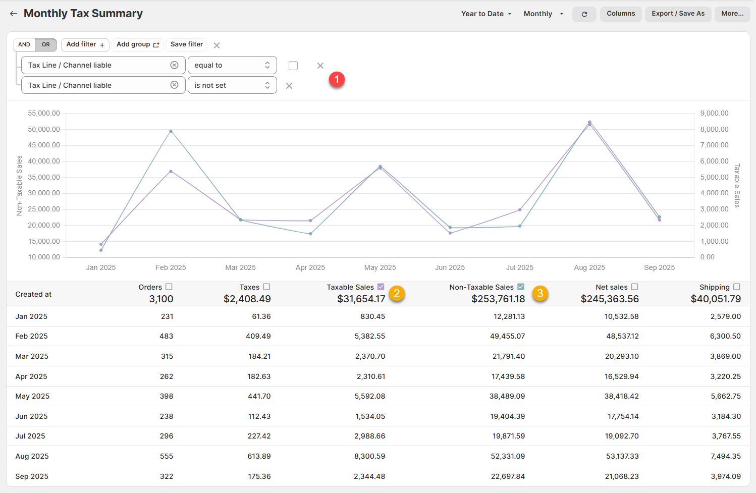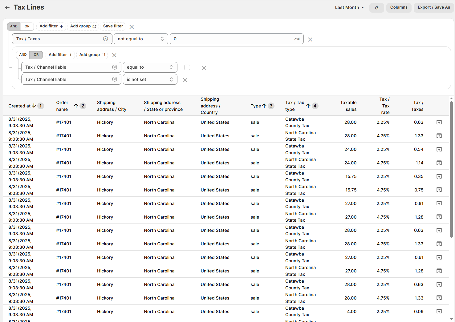 1. (FILTER) Tax / Channel liable, equal to, false OR is not setThis filter ensures that marketplace sales (e.g. Tiktok, Etsy) where the marketplace DOES remit taxes on your behalf are excluded from the report.
