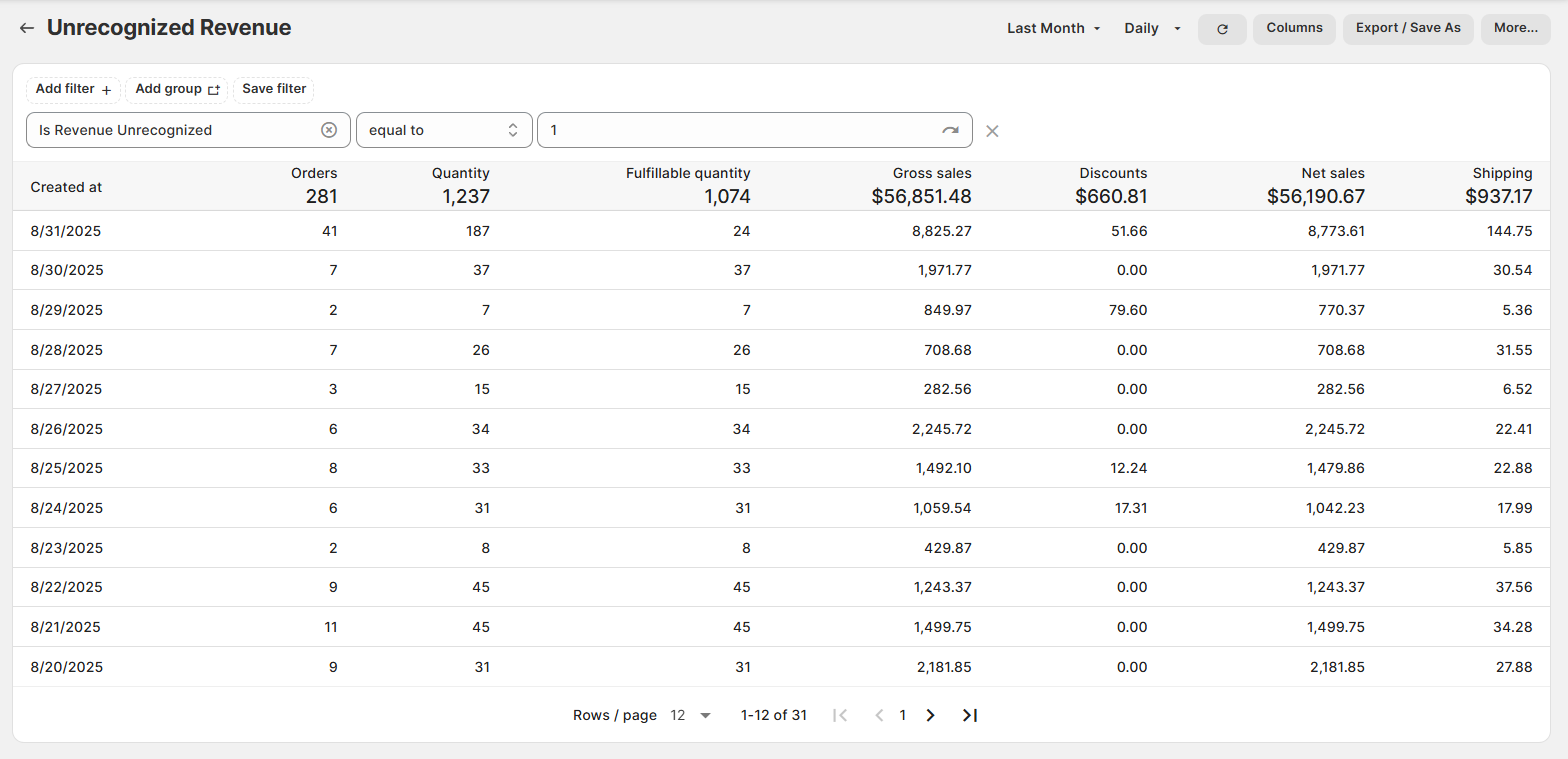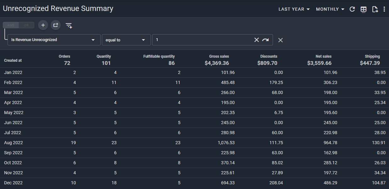 If you're looking for more of an overall summary, grouping all of your unrecognized revenue across multiple orders according to the rules (above) then check out our Unrecognized Revenue summary report: