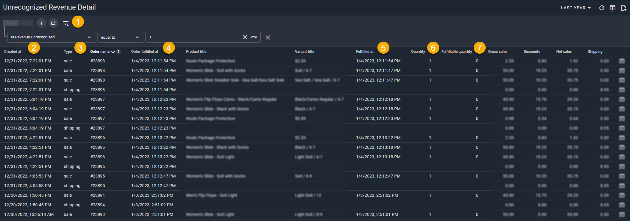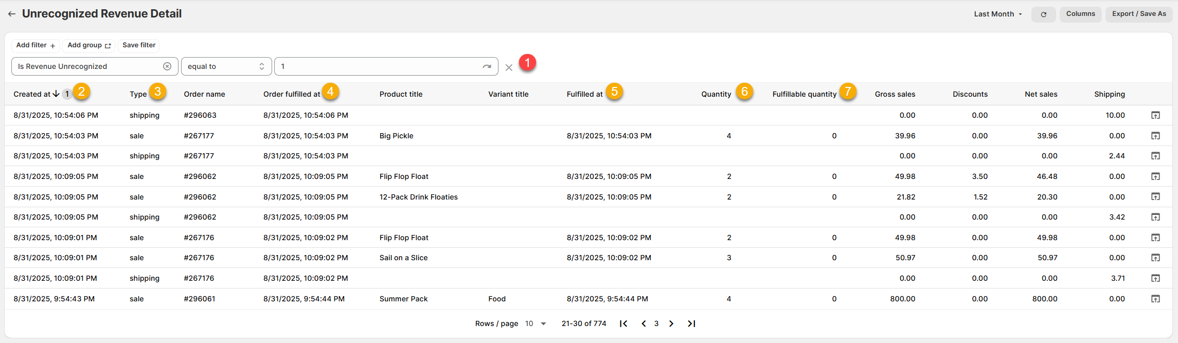 3.) Type: The type for each line on the order. Only Sale and Shipping lines will count as Unrecognized Revenue on this report.