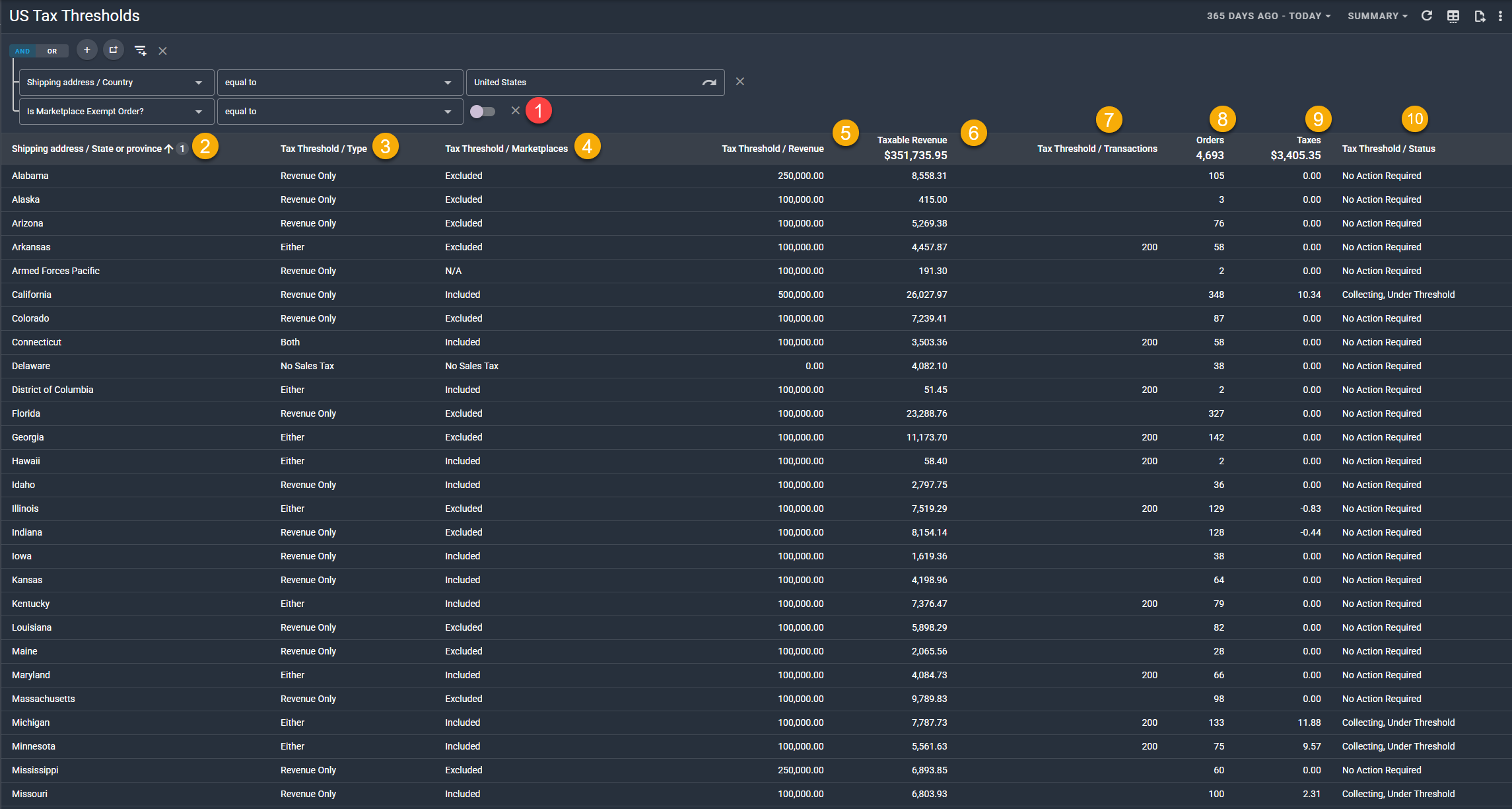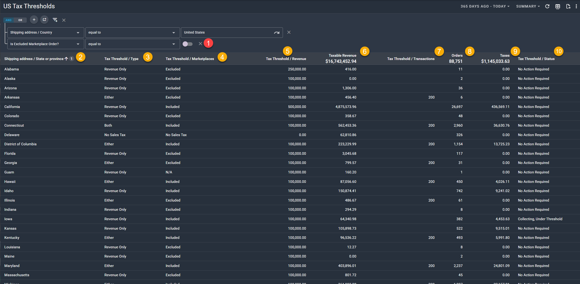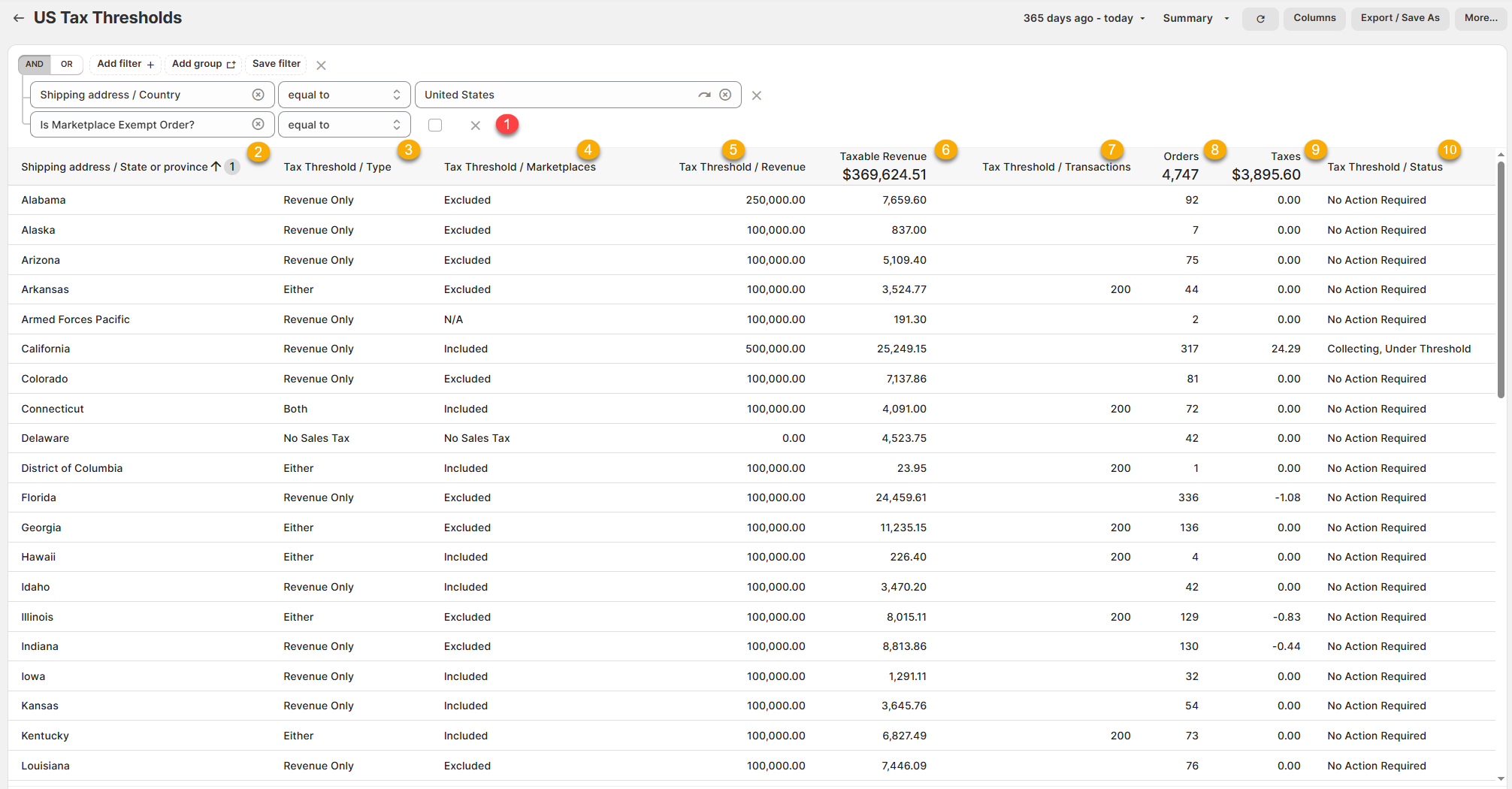 Using this report, you can see what the thresholds are for each state (# of transactions/$ amount), the # of orders/revenue you have for that state, and any actions you need to take.