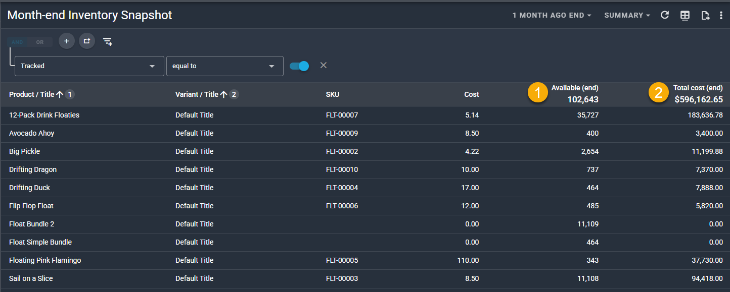 1.) Tracked, equal to, true (FILTER): This filter ensures that only products you have enabled inventory tracking for show up in the report. Best to leave this alone.