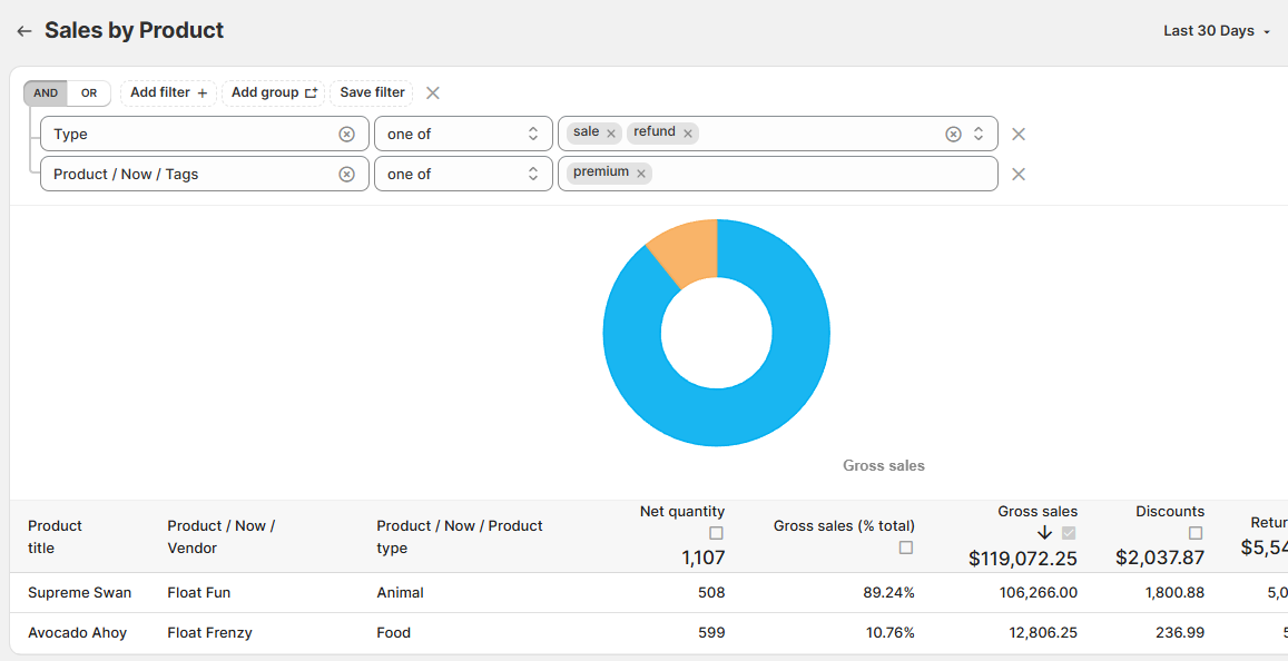 This works great because we are breaking down our sales report by an individual product (or variant) and therefore there is no double dipping on the tags.