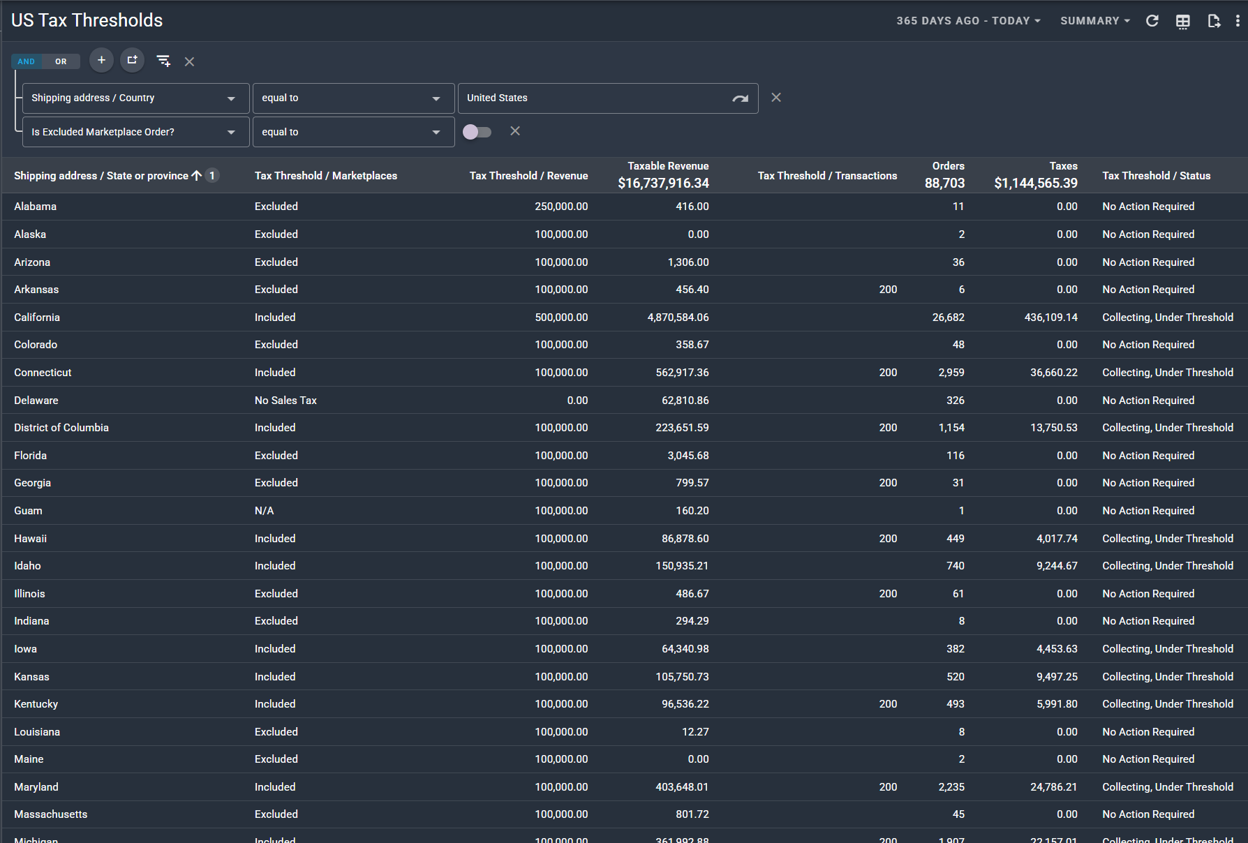 Better yet, the report also automatically filters out marketplace sales if they are excluded, meaning they won't inadvertently count towards the threshold for any given state.
