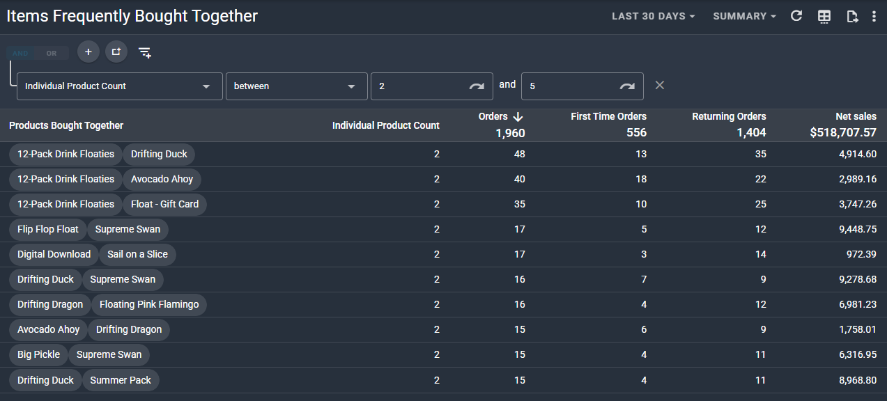 You can use this report to isolate the most popular product combinations at your store and even use the filter to limit the results to a certain # of products per order (default 2-5).