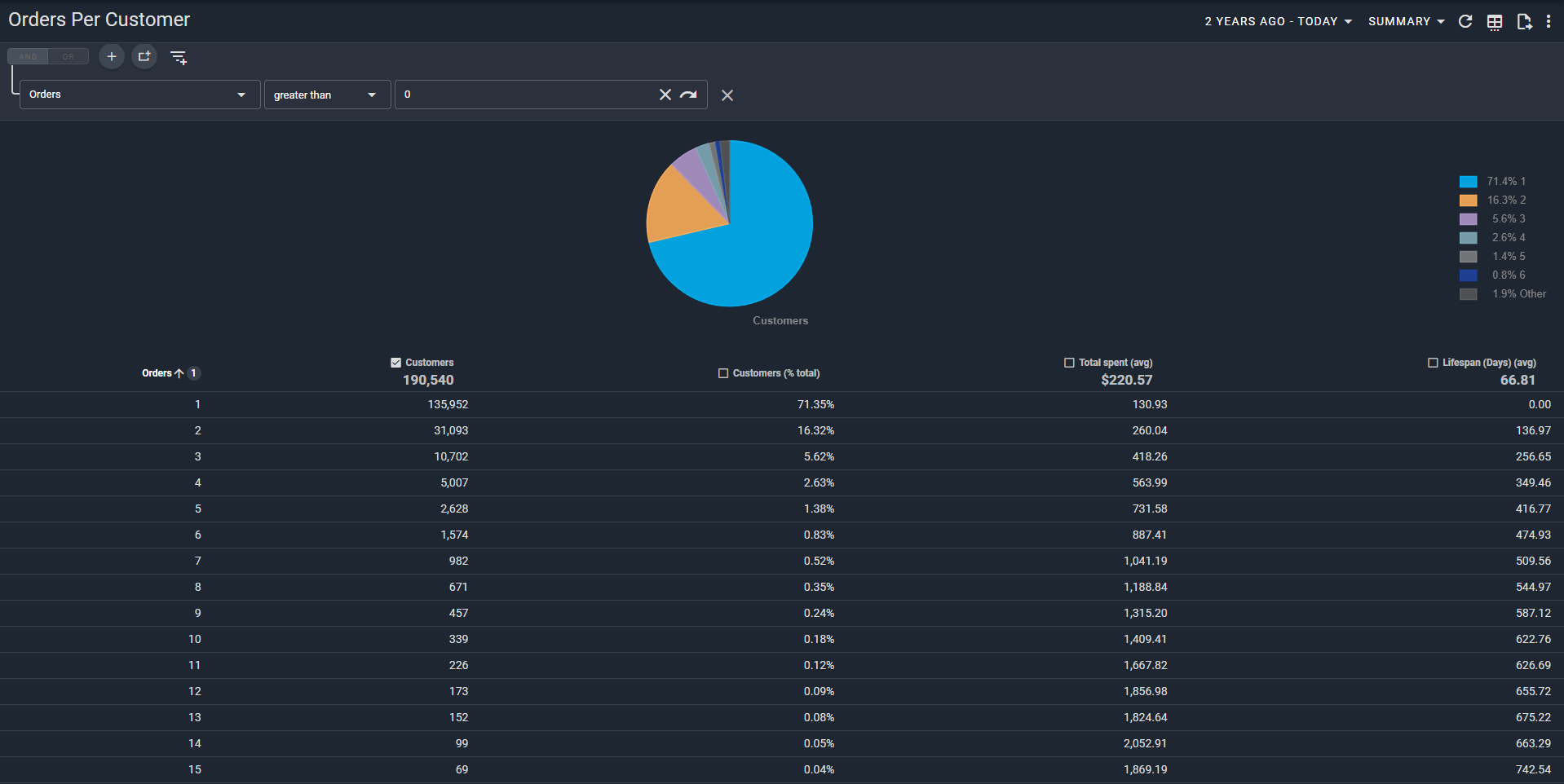 You can also see their average total spend and the lifespan (measured in days between first + last order).