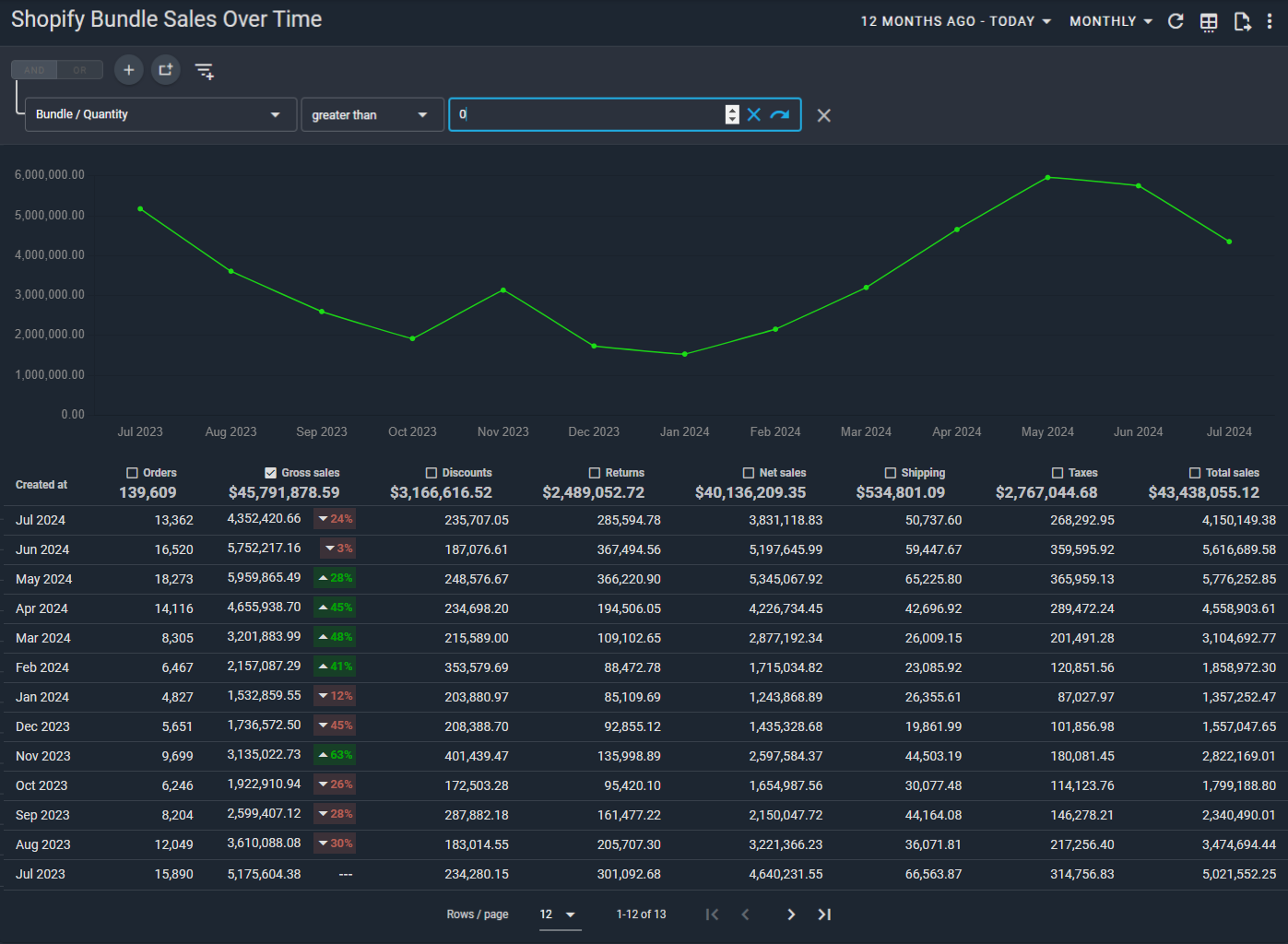Using the Shopify Bundle Sales Over Time report, you can track your bundle sales over a defined period of time (default of one year).