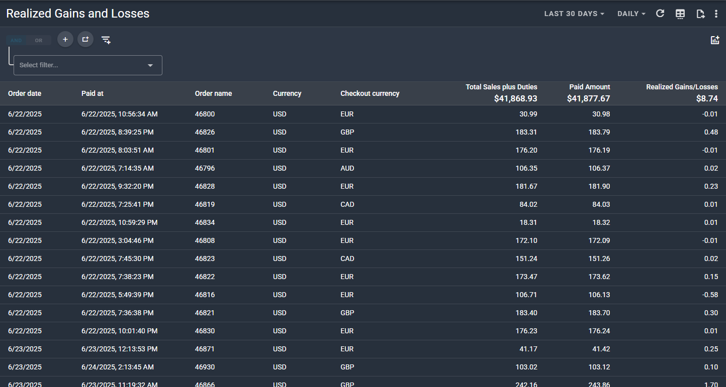 These small differences can add up over the course of the month, particularly if you have many orders involving currency conversion and defer payments for any reason.