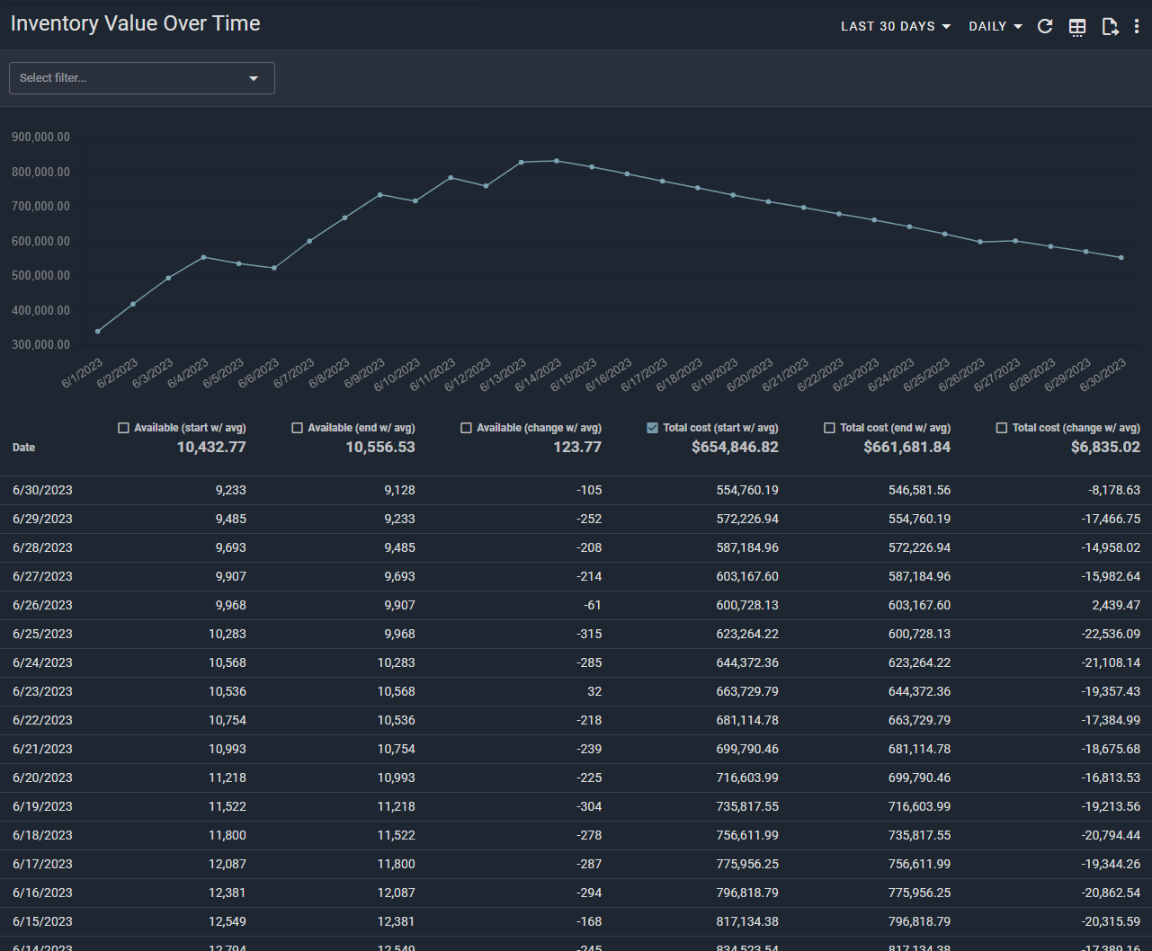 - Inventory Value over Time - To see the cost-based value for your entire inventory on a daily or weekly basis.