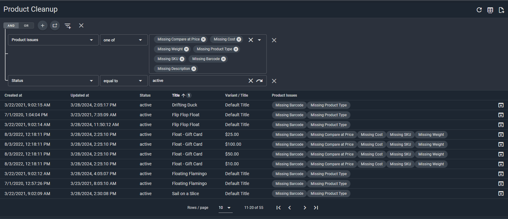 Using this report, you can quickly see which products are missing vital pieces of information (see the Filter for a list of issues, and you can easily remove the ones you don't need).