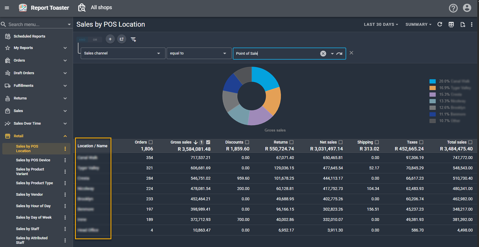 This field is now available on any Orders or Sales report, and we've included it by default on the report - Sales by POS Location (under Retail) as well: